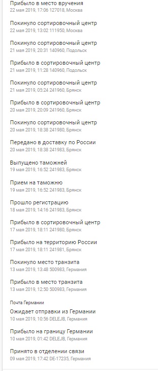 В теме все есть, одна из позиций изготавливалась и грузилась практически с колес. Заказ размещен 1 апреля, отгружен 9 мая, пришел в точку выдачи 22 мая (все оформлено на г. Москва), забрали для меня сегодня) С матами, мол 4 кило, а коробку пришлось тянуть до машины 500 метров)