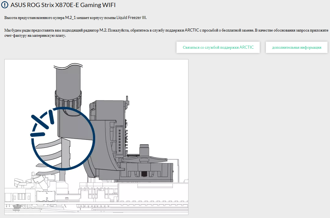 Для информации: водоблок Arctic Liquid Freezer III Pro 360 A-RGB не совместим с платой ASUS ROG Strix X870E-E Gaming WiFi. В единственном возможном положении водоблока на процессоре (а оно одно на AMD) выходящие из помпы фитинги упираются в радиатор для SSD в первом M.2. Кто планирует брать себе такую СЖО для этой платы, учитывайте, что они несовместимы.