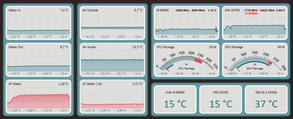 Есть термосопротивление радиатора R. Это та температура на которую он разогреется для рассеивания одного Ватта тепла. Термосопротивление зависит в основном от скорости вентиляторов и незначительно от скорости потока теплоносителя. Если скорость теплоносителя и вентиляторов постоянна, то и термосопротивление радиатора постоянно (строго говоря, это не совсем так, но на наших мощностях и температурах - верно). Конкретно, в вашем примере для SR2@1300 можно найти R = 10 градусов / 300 Ватт = 0,033. Результирующая дельта температур вода-воздух T = Q*R, где Q - отводимая мощность равная сумме мощностей охлаждаемых элементов. Например, если 2080 и 9900к в стрестесте дают 330 и 270 Ватт соответвенно, то нужно будет отвести 330+270 = 500 Ватт тепла. Если охлаждать SR2@1300rmp, то T = 500 * 0,033 = 16.5 градусов. Если бы мы отводили 200 Ватт, то разность температур жижа-воздух составит T = 200*0,033 = 6,6 градусов.