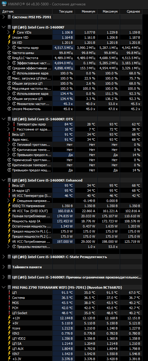 И при этом DeepCool AG620 не держит 14600KF? А при нагрузке какое напряжение Hwinfo64 показывает?