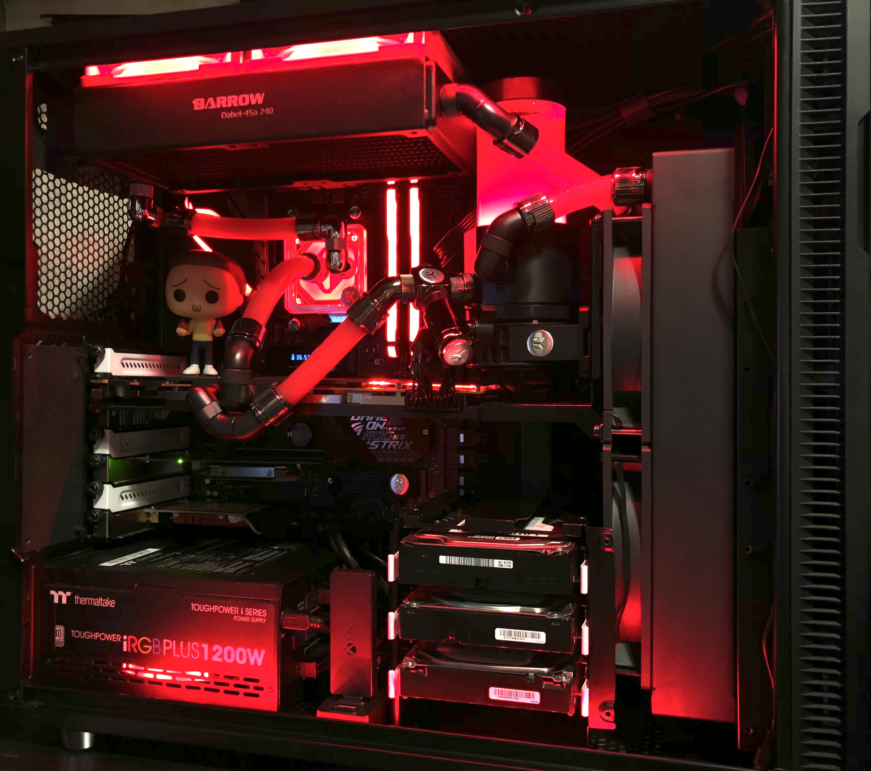 История такая. Так как в начале я хотел сохранить корзину для 5.25 устройств и 4 харда. Грубые расчёты давали понять, что корпус позволит впихнуть в себя много всего. Но по итогу получилось, что 280/45 от ekwb просто не пропускает через себя поток воздуха и следовательно весь корпус голодает без какого либо притока свежего воздуха. по этому там сейчас сэндвич 2 на вдув, 2 на выдув. это съело много пространства спереди.