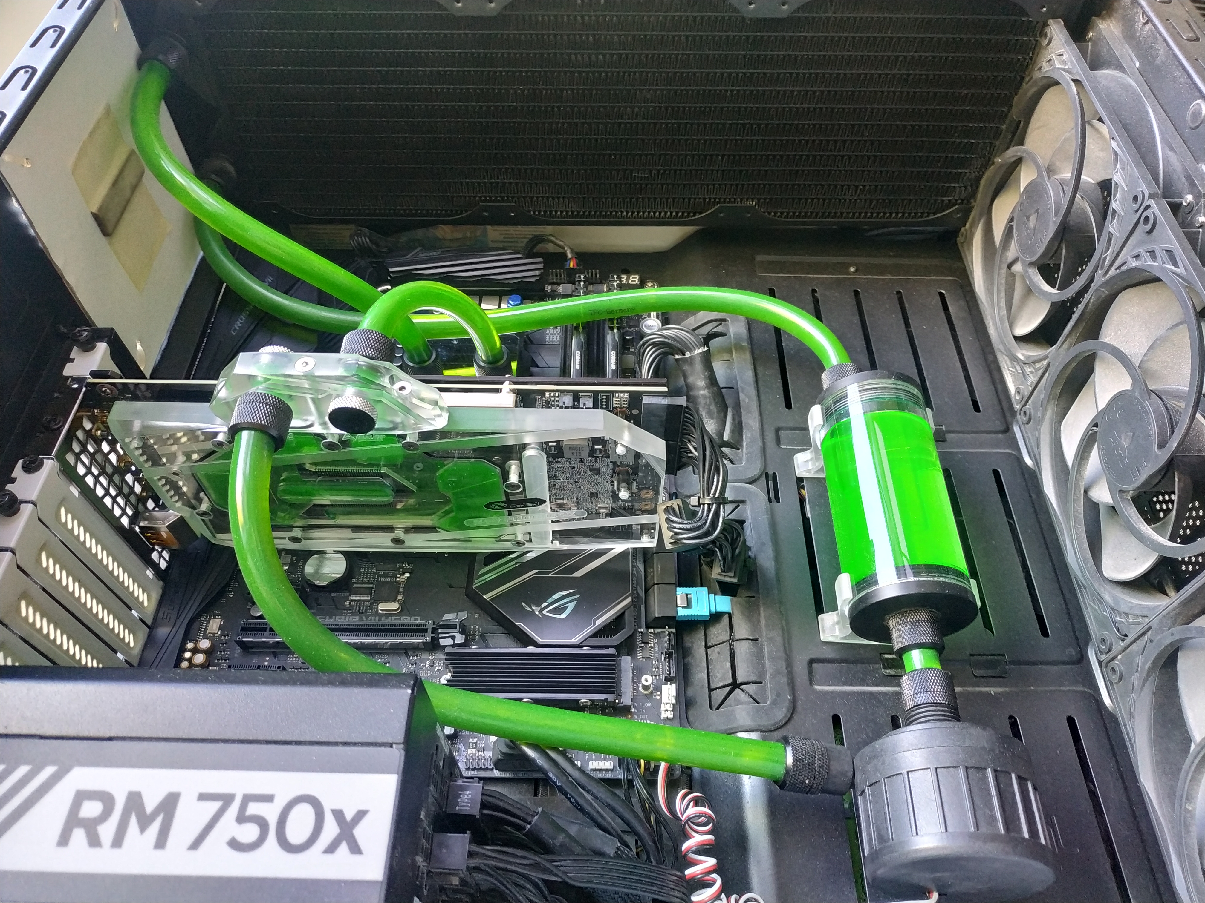 Ну, приятно, что решил проблему/получил желаемое, к тому же, простым способом, ничего не переделывая, кроме простой установки доп. вентилей. По последней картинке, я только бы сделал парочку визуальных "апгрейдов", заменил бы белый скоч на чёрный, обклеил бы черным скочем синий-SATAовский или заменил бы весь кабель & убрал бы ту белую подпорку антиподвисания. Пусть с водоблоком вес карты близок к с стоковым охладом, но карта короче "с меньшим плечем рычага" давит, и так же ее немного поддерживают шланги", "подвисание" имхо не более чем у нормальных карт, у которых обходилось без подпорок. Ну и соподключил бы процовый блок первым после рада, и перепроверил, бы, нет ли для видюшного водоблока указанно желательное направление потока (у моего альфакуловского есть, стрелками возле портов, и вход вроде был наоборот, ближе к i/o брекету).