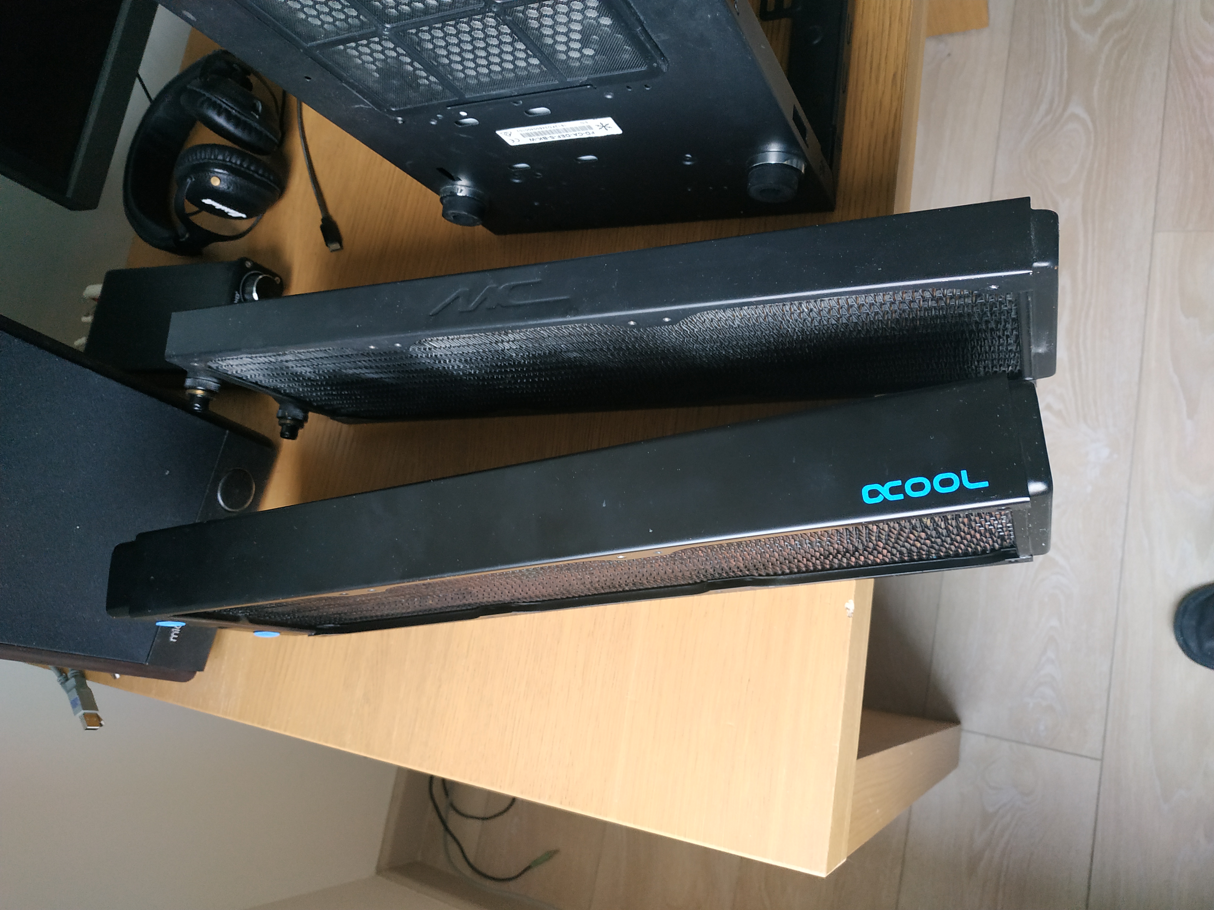 Популярная линейка внешних радиаторов - Watercool MoRa3 квадратной 9х120 / 9х140 / 4х180 конфигураций. Pro имеет шроуд позволяющий установку вентилей с обеих сторон, Lite - с одной, Core - без какого либо шроуда вообще. По монстроидальному размеру одного такого радика должно хватить для эффективного и тихого охлаждения 99% любой конфигурации процов/видюх. Есть и иные похожих размеров/конфигурации, но вроде по тестам менее эффективны. Можно дополнительно докупить декоративные кожухи и ножки. Можно дистанцирующими стойками прикрутить к боку корпуса. Для имеющих очень много лишних денег неплох по дизайну (имхо не плохо будет выглядеть рядом с hi-end hi-fi тумбами ) и интегрированности (имеет включенную помпу, аналог помпово-вентильного контроллера aquaero 5 xt с пультом управления) вариант внешнего рада Aquaduct от Aquacomputer, но вот цена .. Или его монстрозные братя-гиганты с похожим минусом.