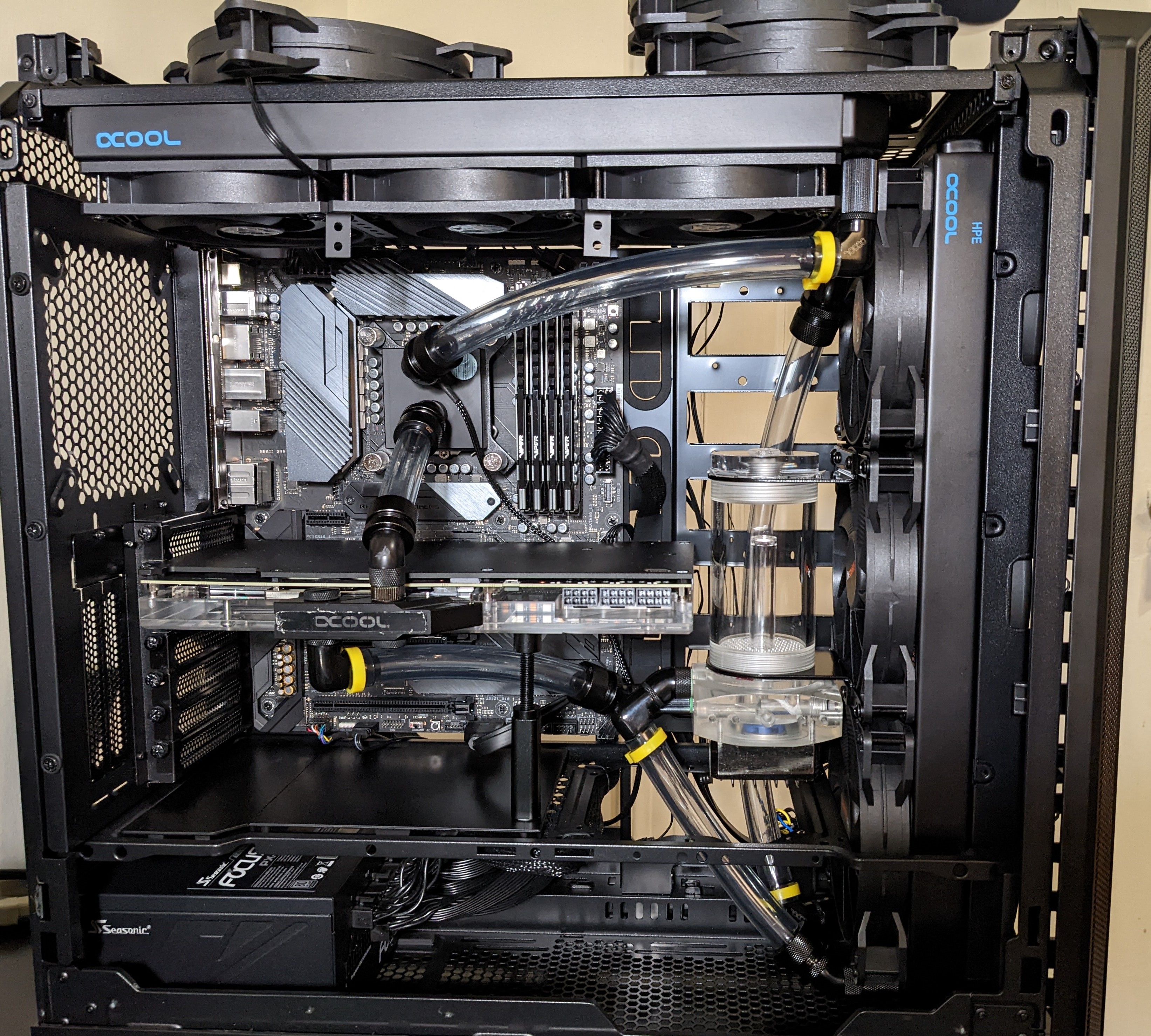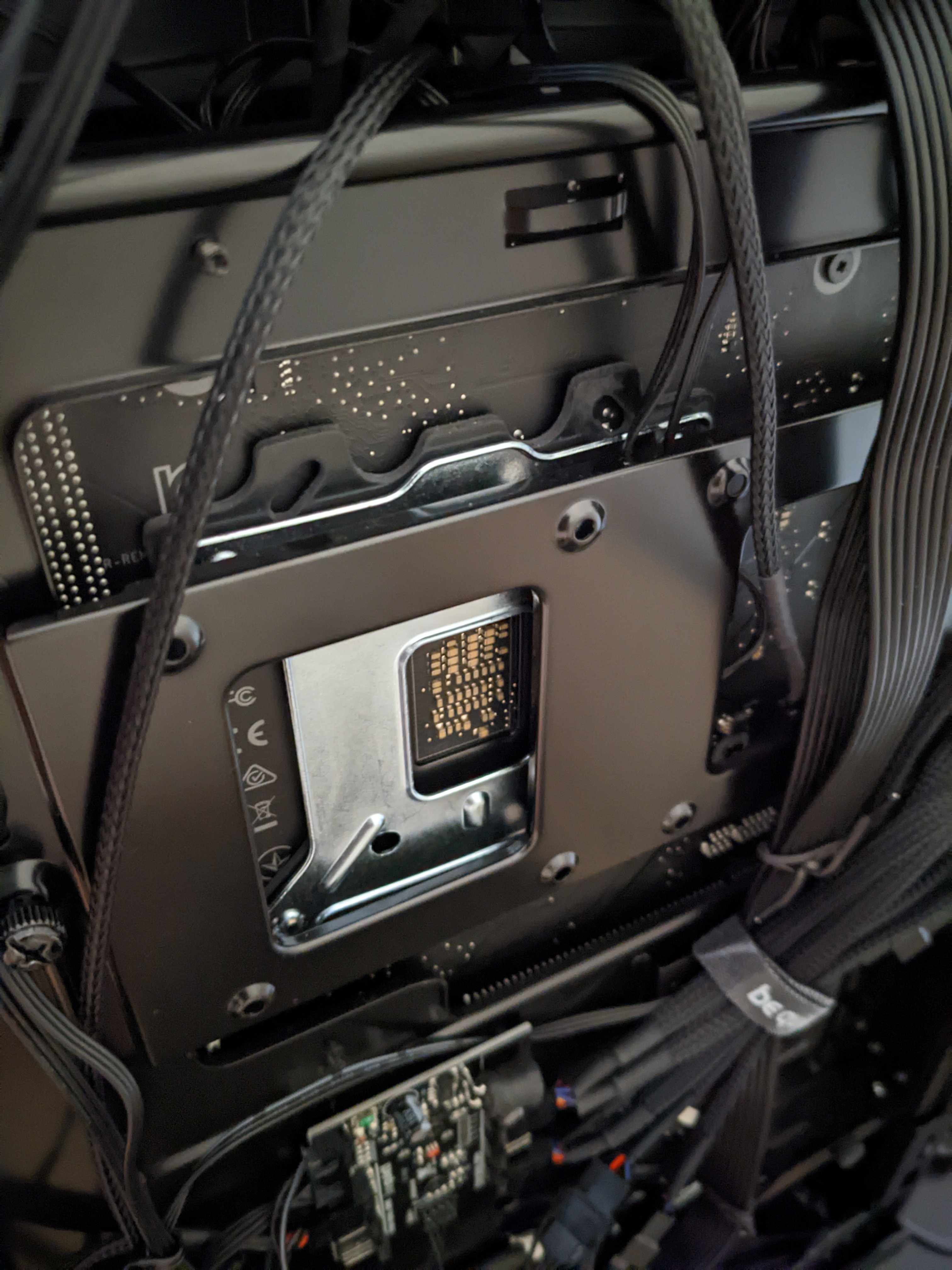 с пастой в данный момент порядок, тонким слоем по всей поверхности. В тот раз, что на фото просто навалил чтобы наверняка исключить вопрос нехватки. По поводу "непонятно". Нижнее фото из тех что не под спойлером. Пластиковый впуск был развернут на 90 градусов вправо относительно того как он должен стоять. Поставив нормально, при установки колдплейта почувствовать, как впуск упирается в разгонную плиту. В неправильном положении такого касания при закручивании не ощущалось. В общем, разобрал-собрал уже в третий раз, потому что маразм крепчал, и подумалось, а не возможно ли что та часть впусного механизма, которая является съемной - на которой выемка под поток впускного фитинга - развернута на 180. У меня оставался только вариант с тем что пластик блокирует впускной поток и большая часть жижи просто минует колдплейт. Оказалось-нет-невозможно, она в единственно возможном положении устанавливается. Честно, меня уже настолько вымотала эта сборка, что просто заьбю болт. Видику хорошо, ну и ладно. При условных 400Вт температура на 3080Ti не выше 47, память 66. Внутренний перфекционист успокоен тем, что сделал все что мог. Сейчас установлен впуск I2 - АМД/2011 и джетплейт J2 для 1151. В покое - все та же разница с графическим процессором в 4-5 градусов. Тестить Cinebench смысла не вижу. Кстати, при последнем снятии ватера, контак был просто идеальный. Там такой вакуум образовался за те 15 минут что я тестировал, что очень проблематично было отодрать подошву от крышки ЦП. Возможно, сильно кривой проц, я не проверял. Возможно, припой под теплораспределительной крышкой 9900К действительно не рассчитан на 200+ ватт. Появится энтузиазм - сделаю скальп, ибо вариантов немного осталось. На этом всем спасибо кто поучаствовал. Впрочем, будут какие мысли, пишите.