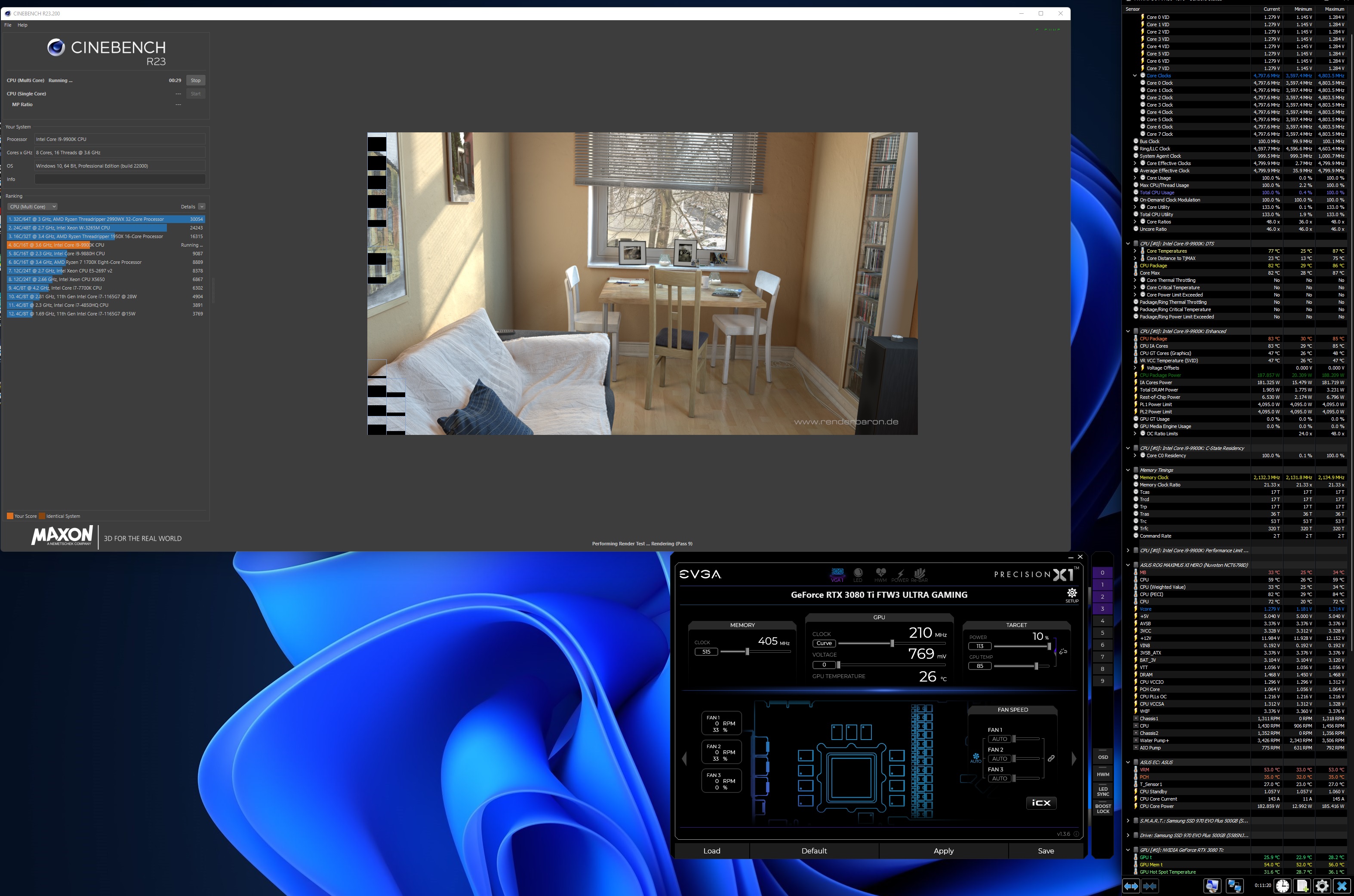 Теперь нагрузка. Cinebench R23 10 минут. 4.8GHz. +0.05v offset; LLC - 7. Температура воздуха 21. VCore при стресс-нагрузке, как видно 1,31v в пике. Энергопотребление - 189W максимум. Температура - 87