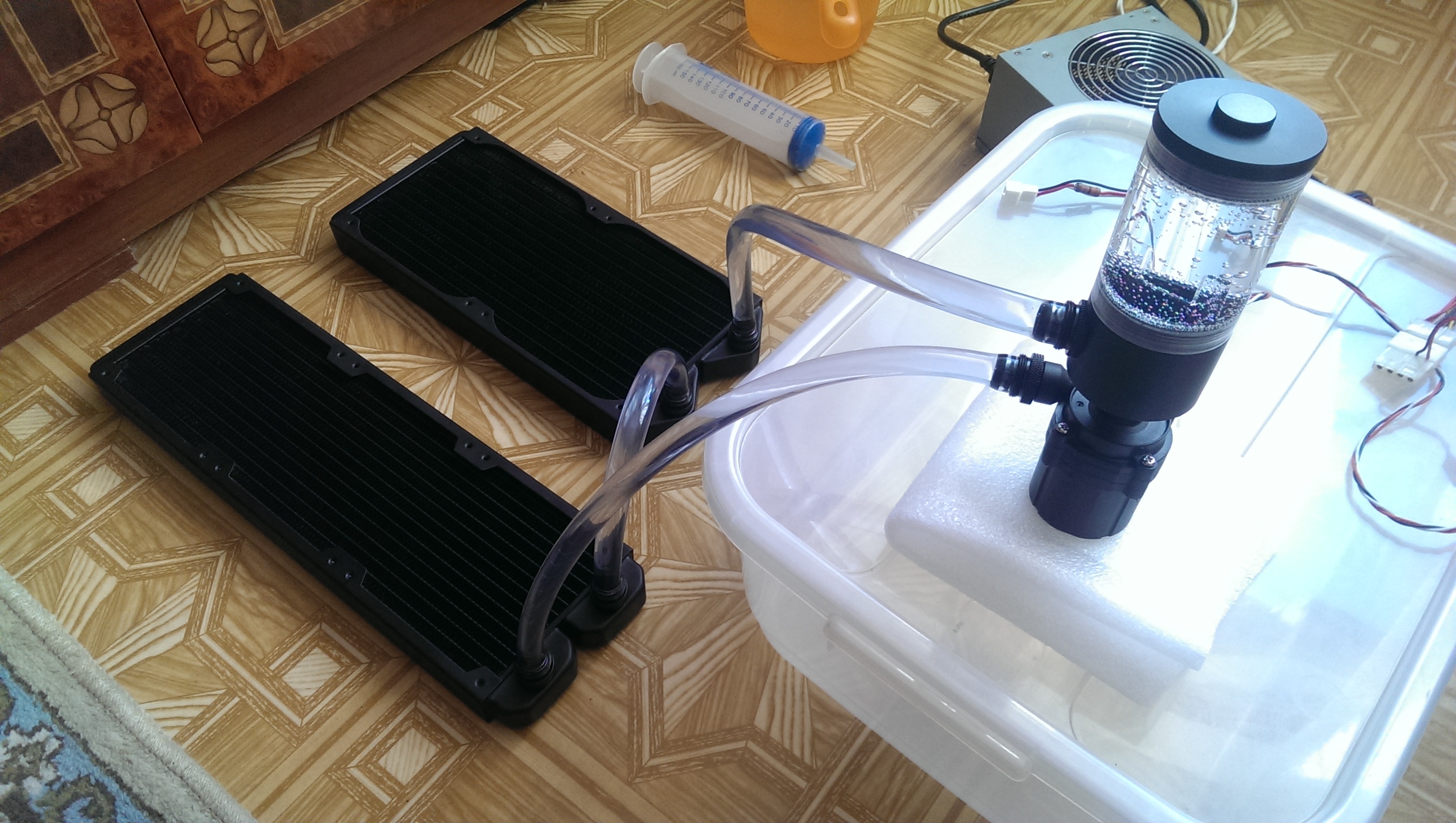 Добавлено спустя 2 часа 58 минут 27 секунд: Часовой прогон двух китайских радиаторов (360 от Formulamod(bykski) и 280 типа от MagicCool но без каких либо опознавательных знаков на самом радиаторе) и помпы SC600 особого мусора и протечек не выявил:) Помпа не стучит, вибрация присутствует небольшая. В последствии её буду отдельно от реза на шланге вешать в корпусе. Ожидаю прибытия водоблока Bykski CPU-XPH-B с акриловым верхом и каналами 0.5мм и после буду собирать) Но морально уже настроен на дальнейшее приобретение EKWB Supremacy EVO после тестов
