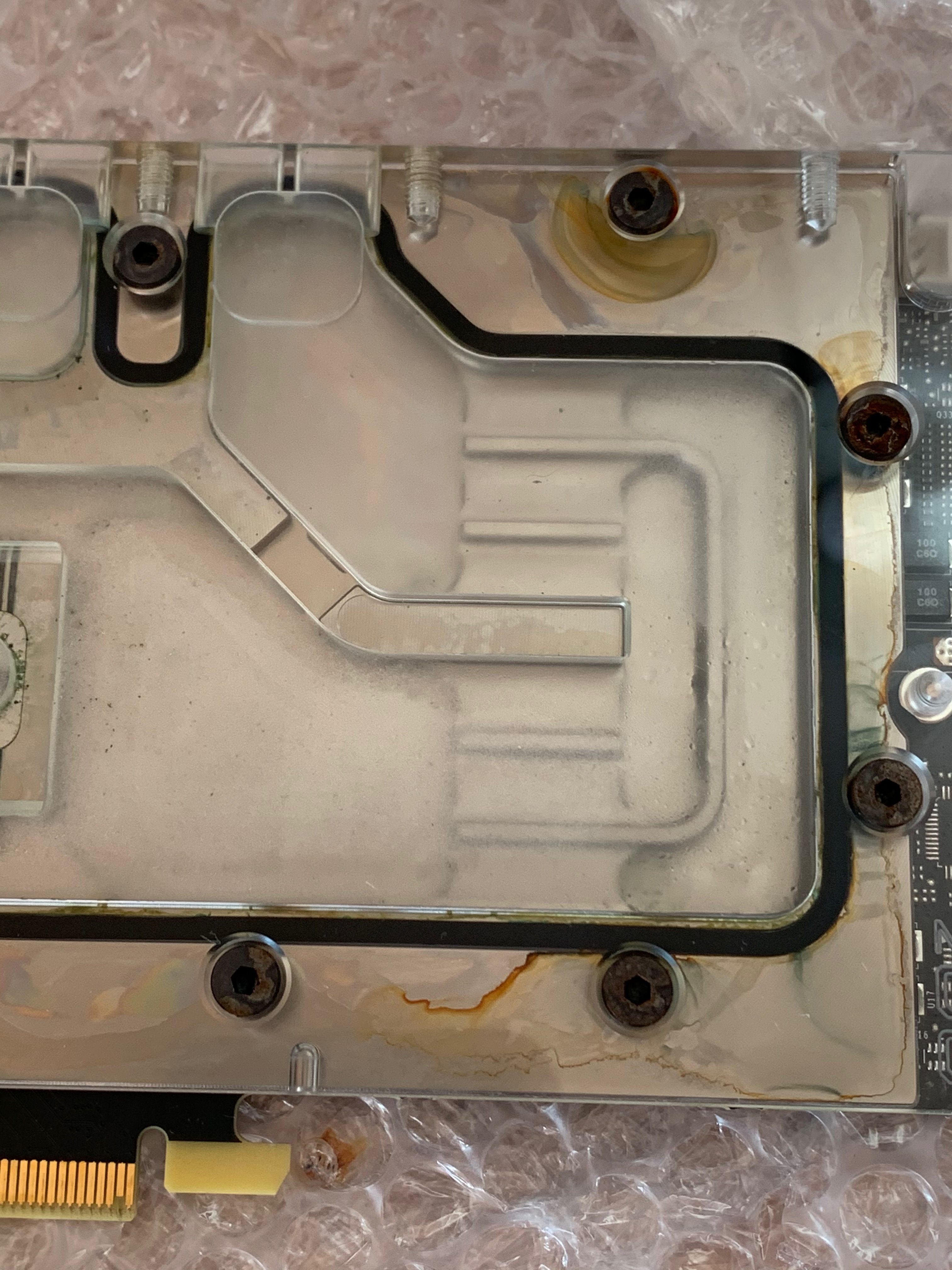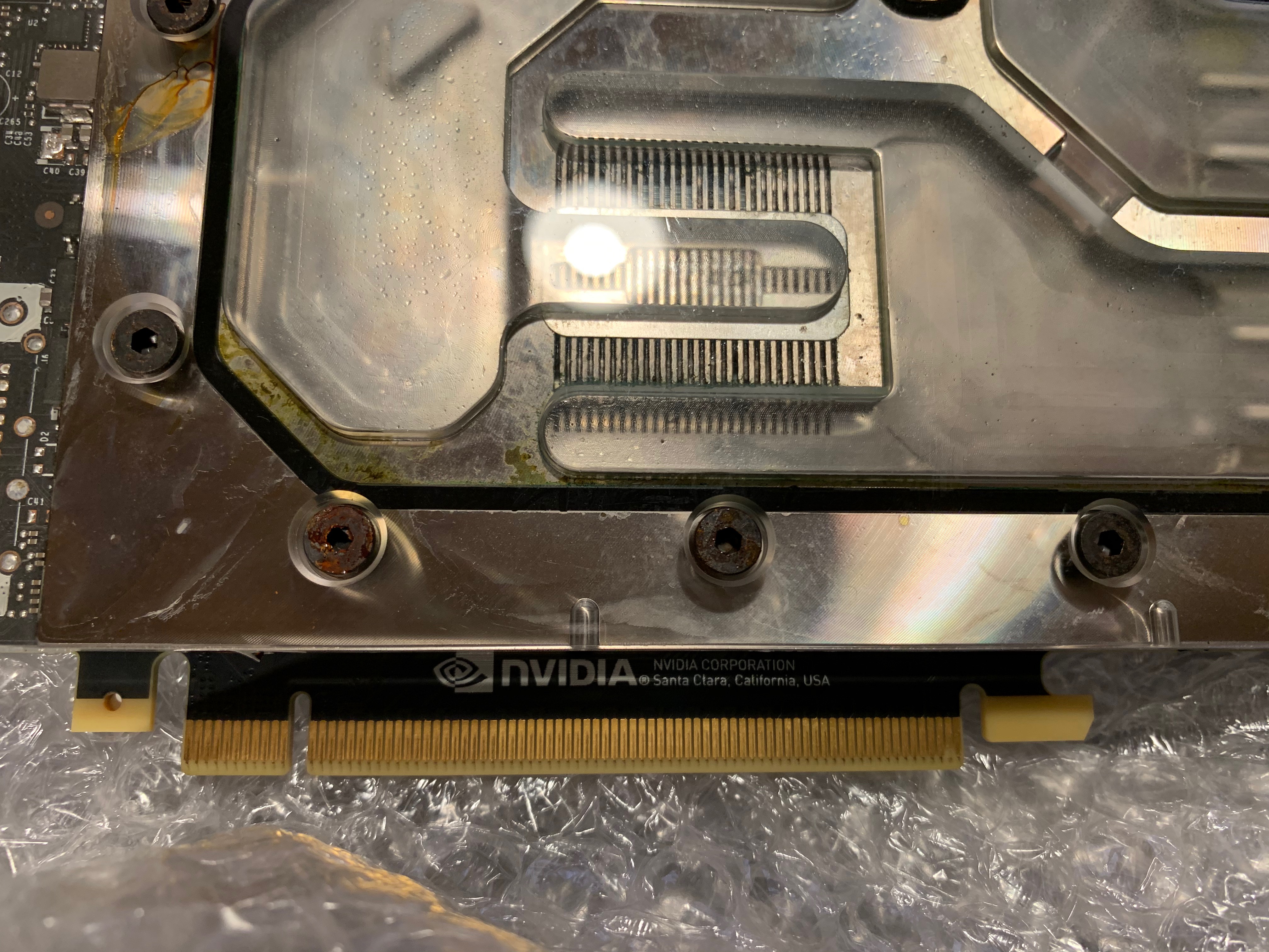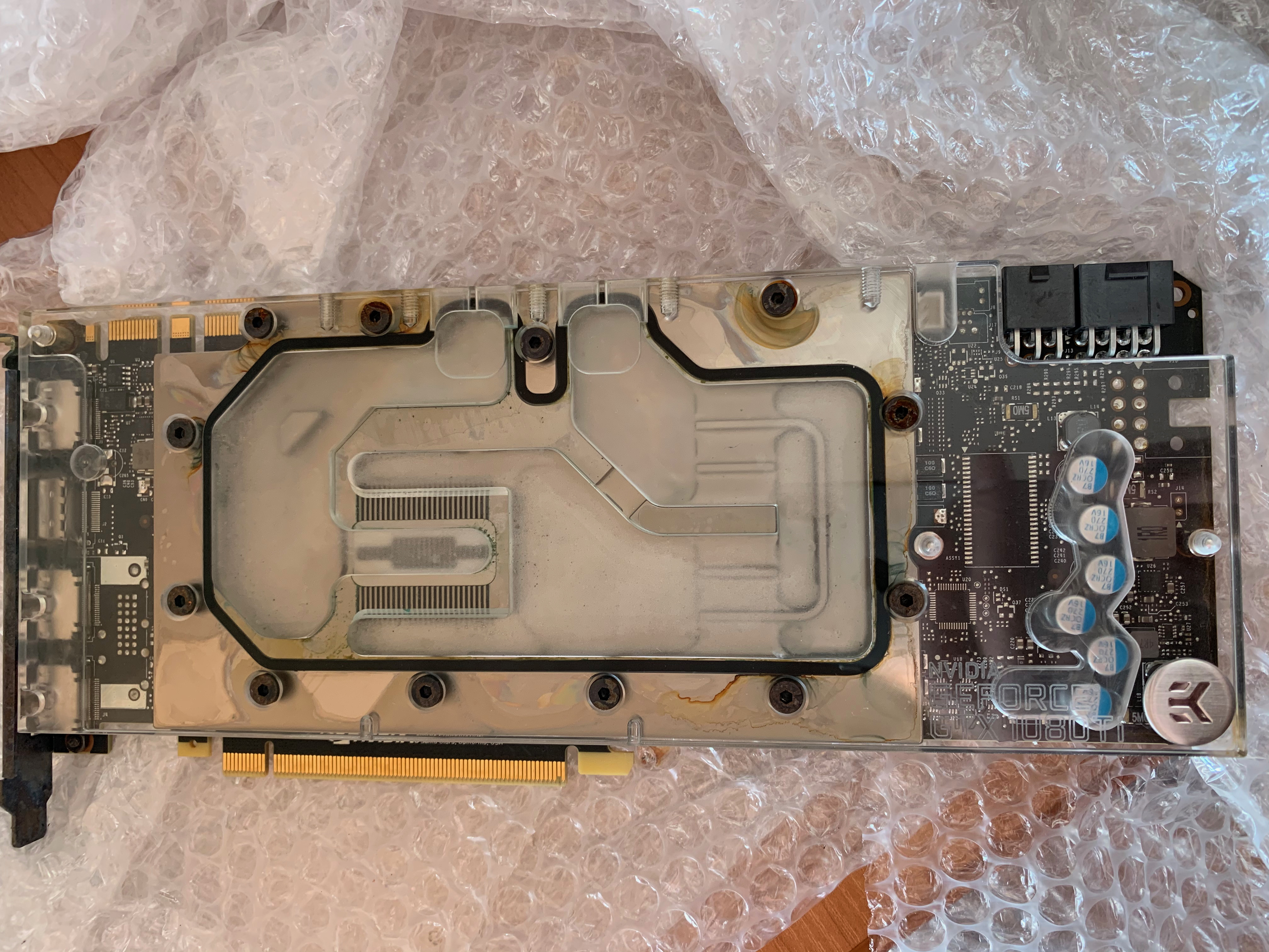 Такая проблема: приобрёл удаленно 1080ti с EK водоблоком, но видимо продавец не совсем до конца слил жижу, ну и в общем, карта мне пришла вот в таком виде: