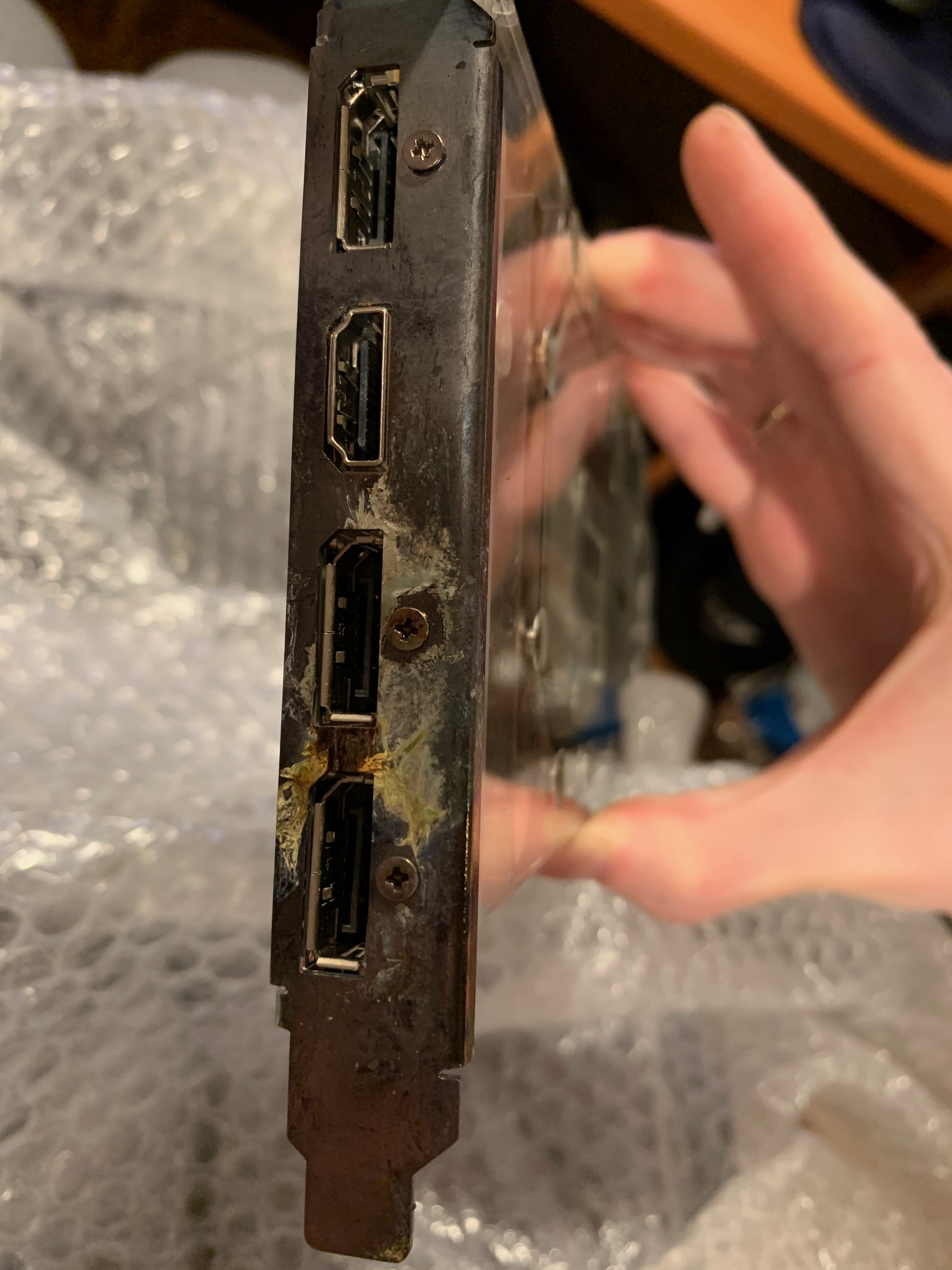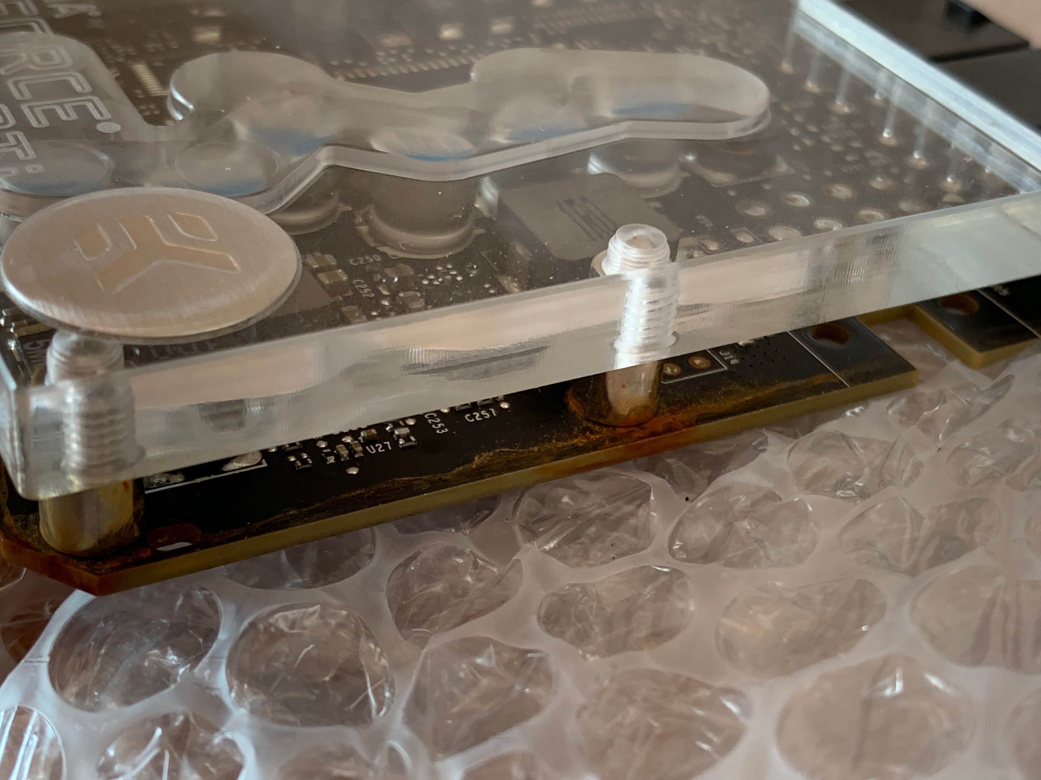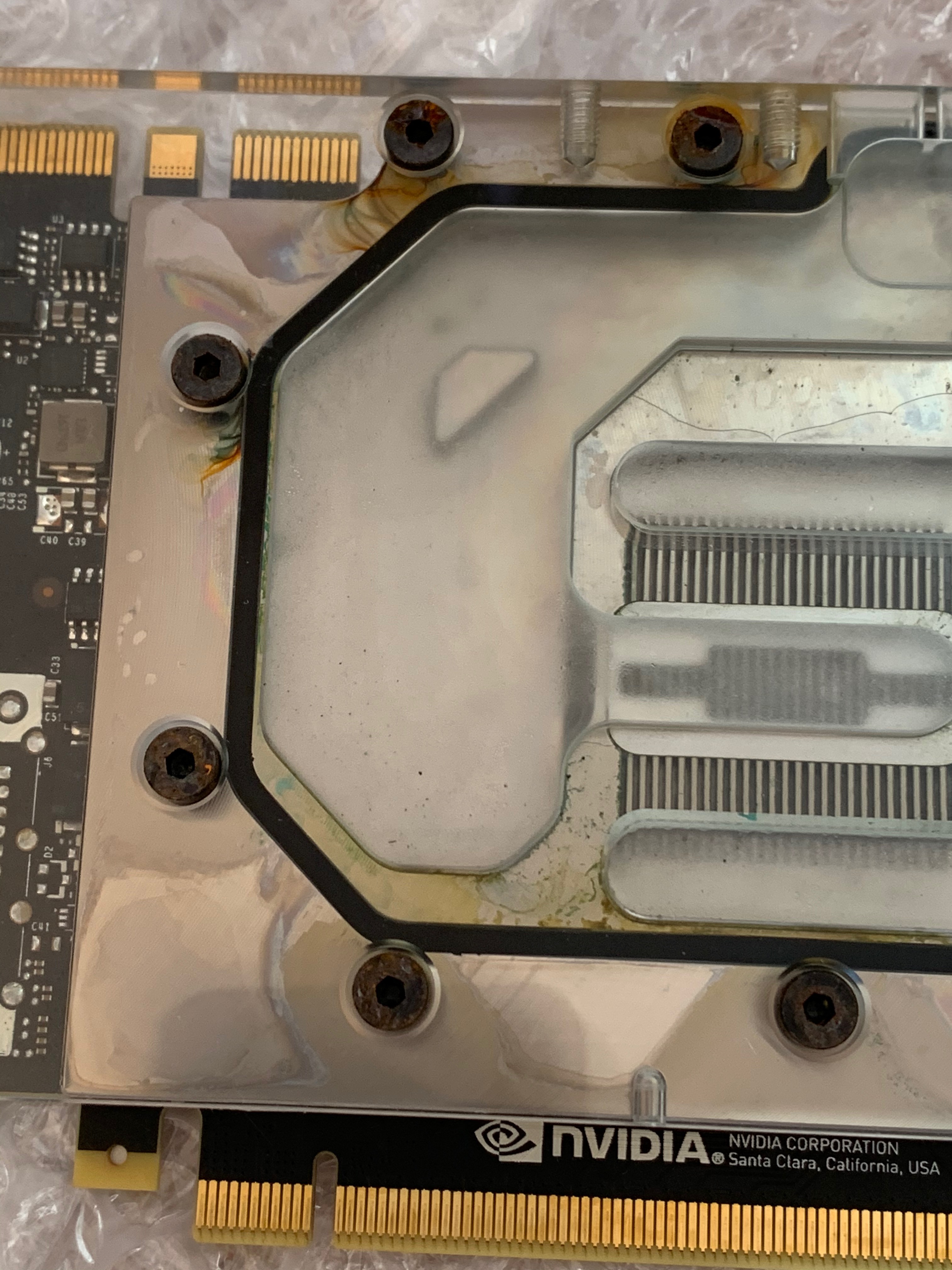 Такая проблема: приобрёл удаленно 1080ti с EK водоблоком, но видимо продавец не совсем до конца слил жижу, ну и в общем, карта мне пришла вот в таком виде: