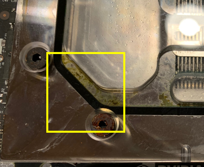 atlonnbomber91ParKurd3ma Спасибо за советы! У продавца они стояли в Quad-SLI, он фото показывал. Ну то есть, крайне маловероятно, что карты хранились где-то в убитом виде. В общем, я в это пока не хочу верить Просто они ещё ехали без терминалов куда фитинги вкручиваются (кстати, может есть у кого? Купил бы за умеренную цену, всё равно нужно, хоть продавец и положил большой Quad-SLI терминал) и скрученные в пупырчатую плёнку, соответственно вода даже если и не вытекала, то испарялась через эти два отверстия, ну и вот результат: