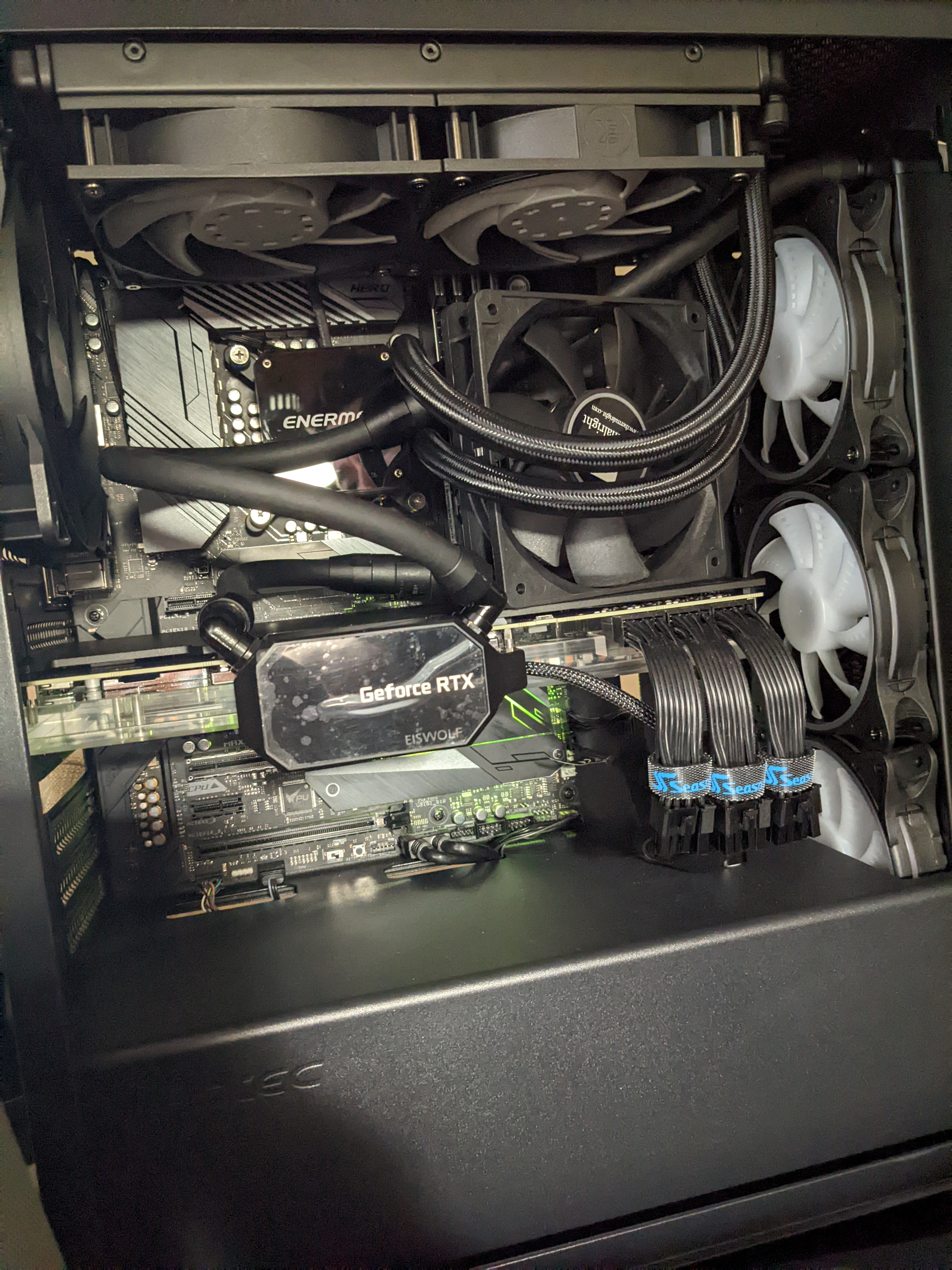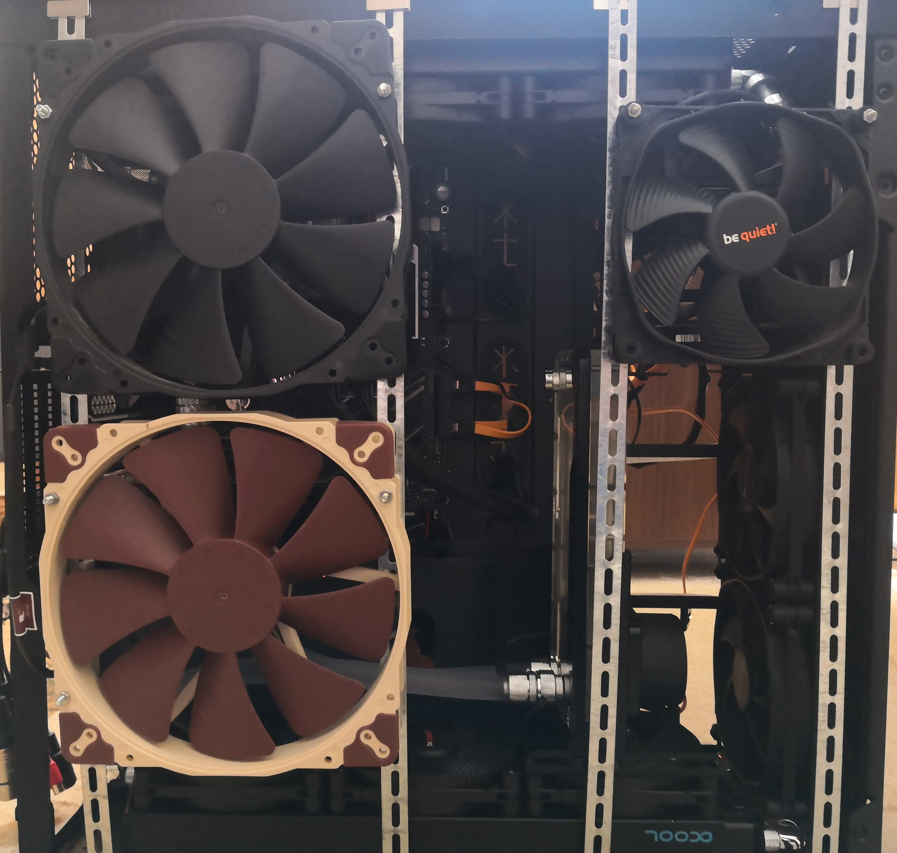 Хочешь все в одном корпусе без моры. Делай как я. Корпус Corsair 7000D. Есть еще несколько корпусов где есть возможность организовать подобное. Стоит два радиатора. Верх 420. Бок 360. Морда 3 вертушки вдув. Задняя вертушка тоже вдув.