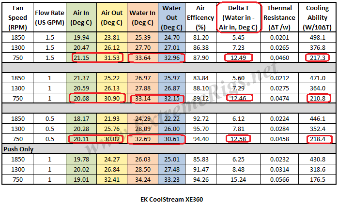 Дельта воздуха при 750RPM 0.5GPM -12.58C, 1GPM-12.46C, 1.5GPM - 12.49C, Отводимая мощность при дельте воздуха 10С - 218Вт, 210Вт, 217Вт - вывод, от потока эффективность радиатора зависит слабо