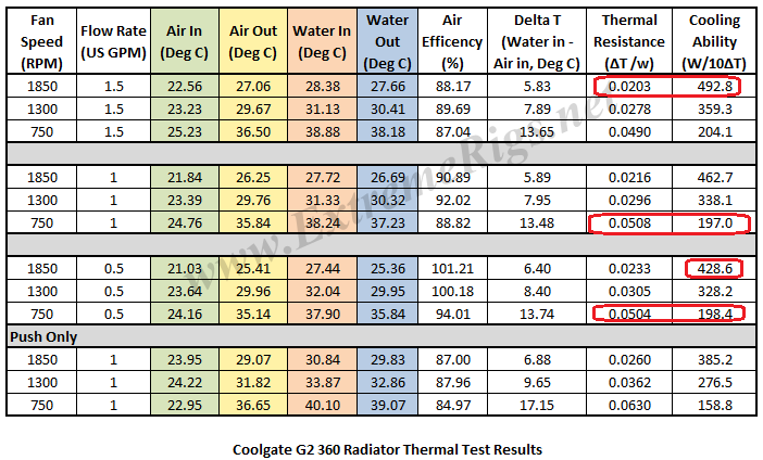 750RPM PUSH/PULL 1GPM При дельте вода-воздух 10С первый радиатор отводит 197Вт по таблице.