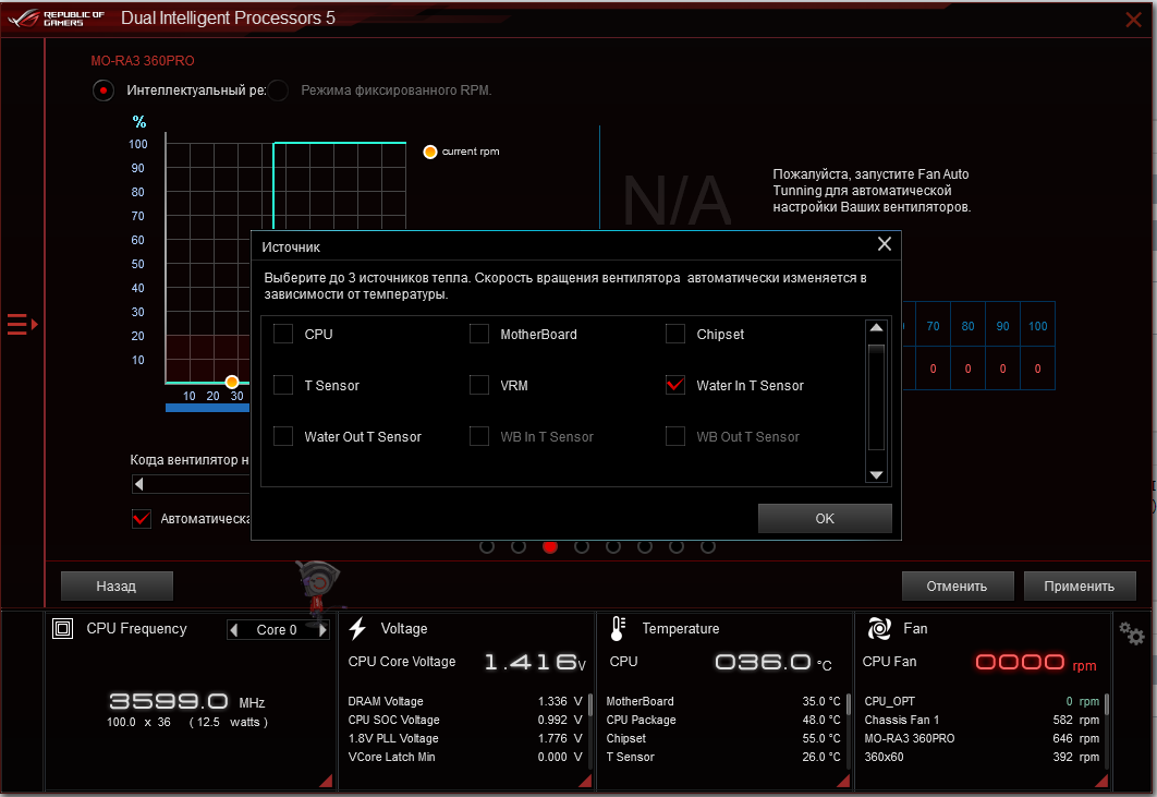 На данный момент установлена AI Suite от Asus, но с ней какая-то проблема - как только меняю источник температур на T_sensor, W_out или w_in (с соответствующим "перетыканием" датчиков) - обороты перестают регулироваться, как бы не настраивал кривую