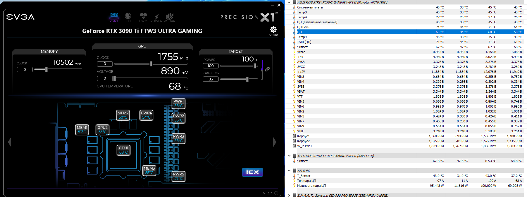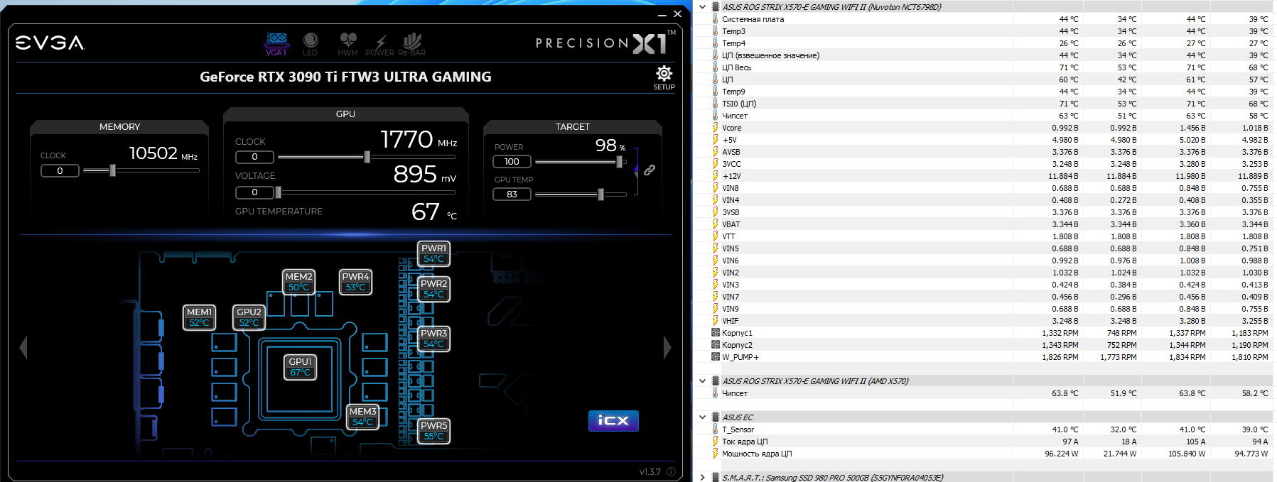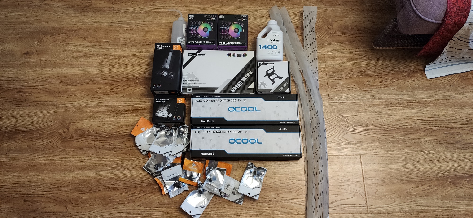 Коллеги, форумчани обращаюсь к вам ввиду того что словил дикий фэил со сборкой кастома. Расскажу немного предыстории, был у меня пк с 5900х на Asus ROG Ryujin 360 и карта EVGA GeForce RTX 3090 Ti FTW3 ULTRA GAMING на стоковом воздухе. Проц грелся до 68* под гнетом видяхи, видеокарта 72-74* с сопутствующим шумом. Все было более менее хорошо, но захотелось собрать кастом, чтоб карта тоже была на воде, и все было тихонько и красивенько. И я подошел к этому основательно. Вывалил более 100р за все про все на фото ниже: