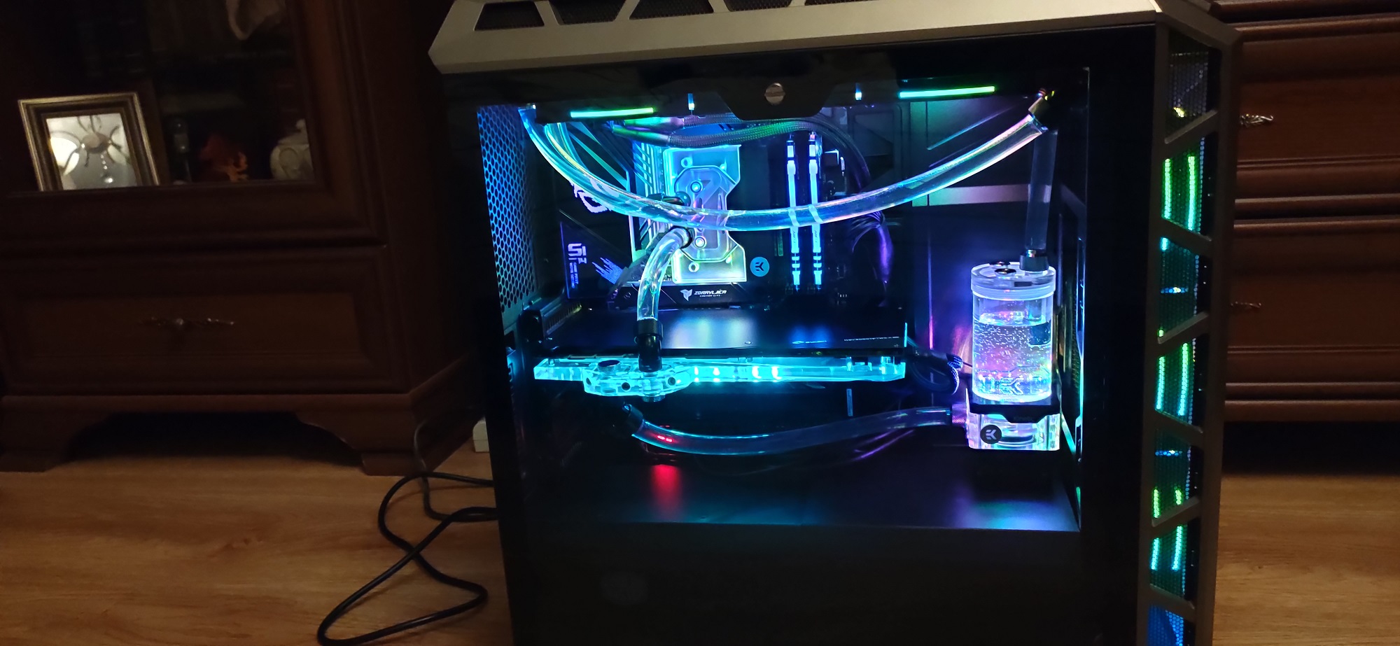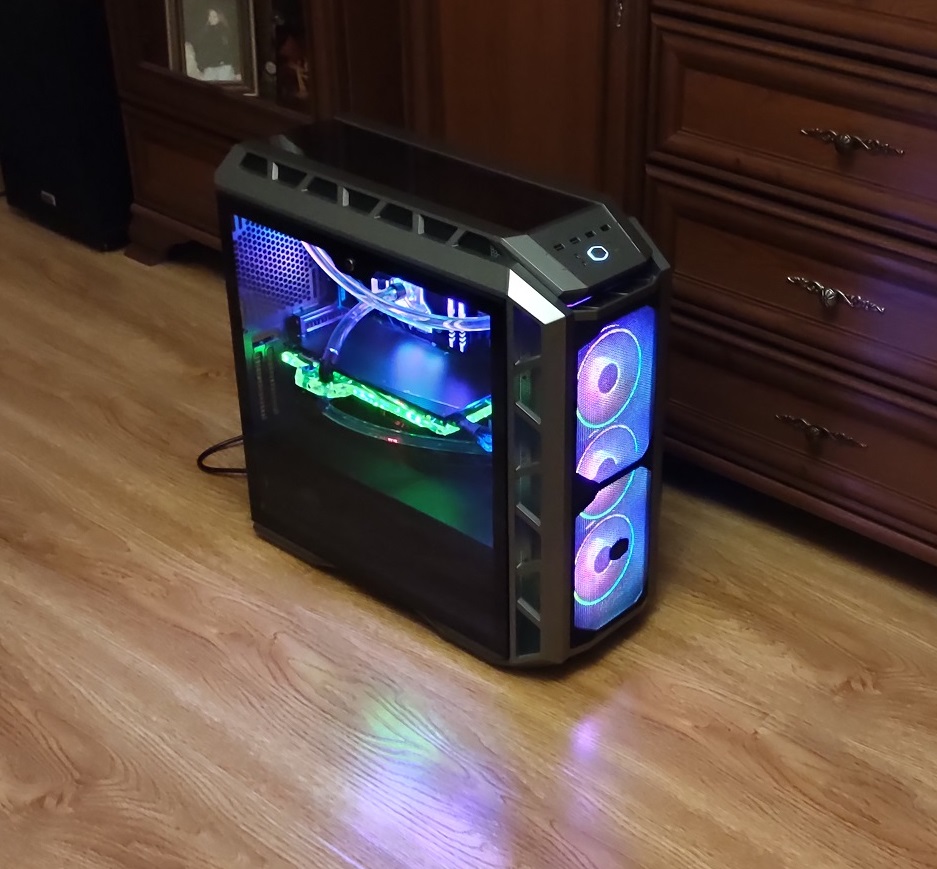 2 дня раком стоял все это собирал, пытался впихнуть невпихуемое, радиатор упирался в мать, пришлось переделывать систему, но по итогу все влезло и уместилось. Внешне вышло достаточно симпатично и красиво, но не эффективно:
