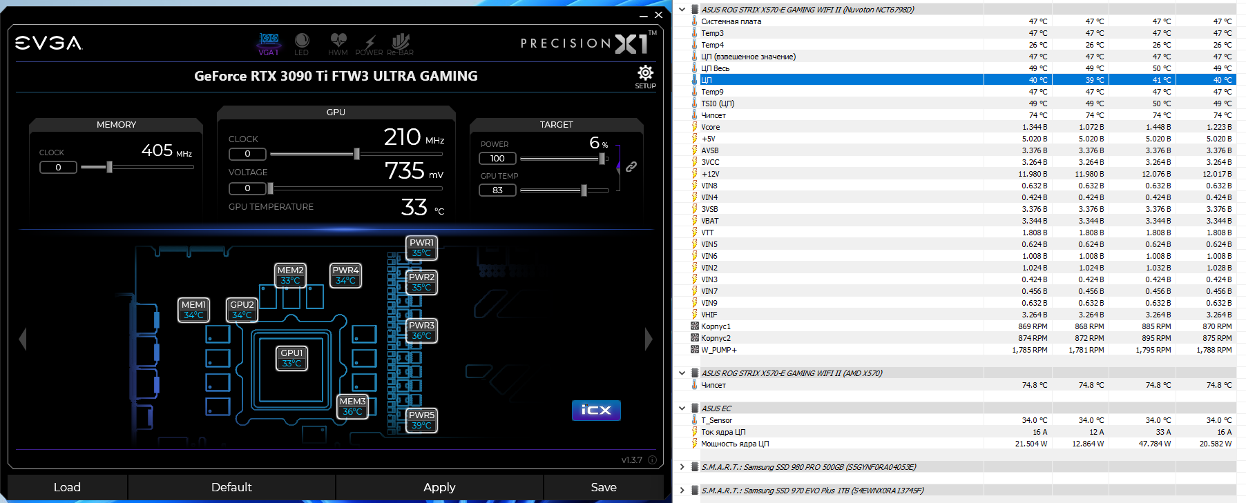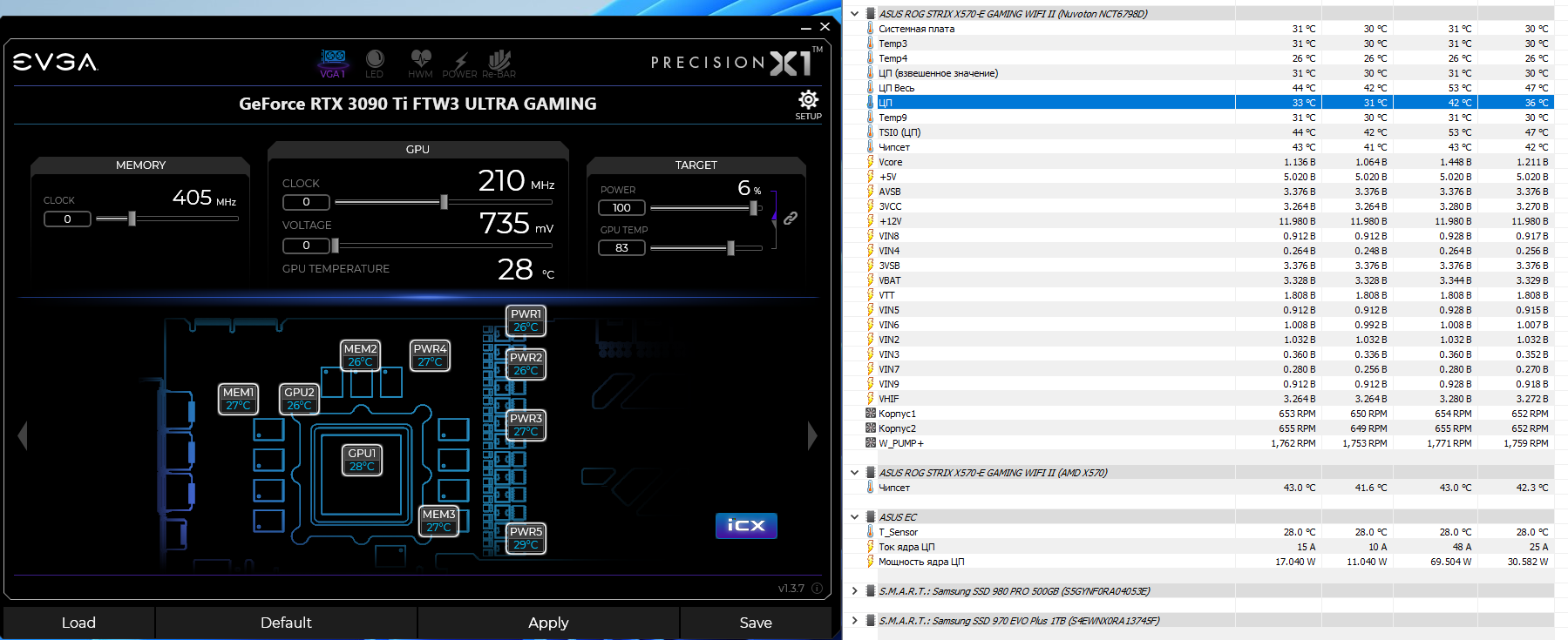 При запуске пк на холодную я получил 28* вода =Asus EC T_Sensor -это датчик вкрученный в радиатор ввиде заглушки порта. 28* видяха и 33* ЦП. Вентиляторы на 650ртм