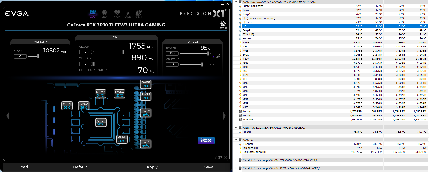 А вот дальше беда, при стресс тесте с 100% нагрузкой гп/цп цифры улетают в космос, вода 47*, видяха 70* , проц 63* вертушки в максимум 1800ртм, для понимания у меня до этого проц грелся в районе 66* и карта до 74*