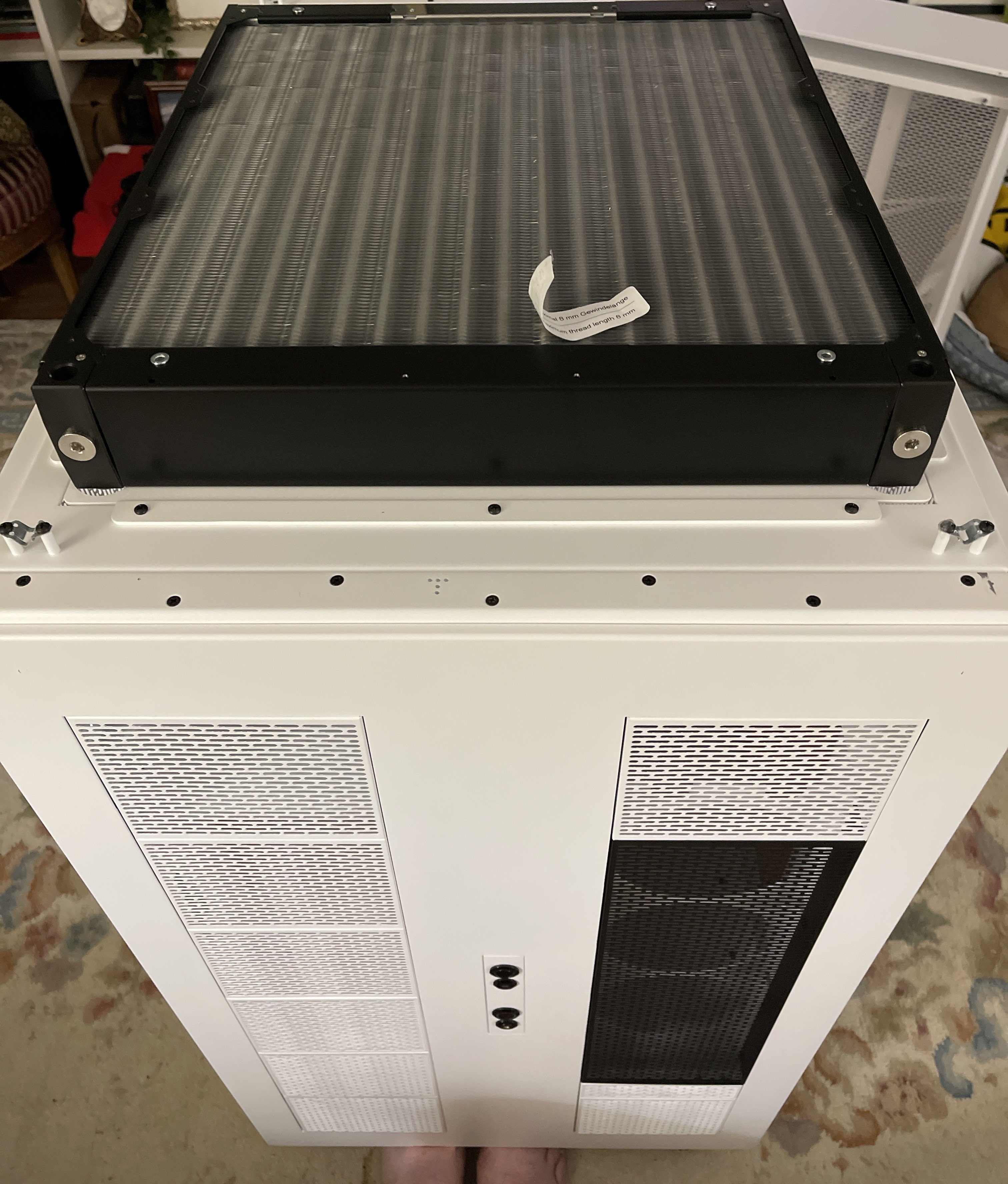 Никогда не понимал этого извращения. Кричать что внешний рад занимает много места, но при этом покупать гроб и пихать в него внешний рад. По мне, внешнему раду нечего делать в корпусе, он на стенке занимает куда меньше места, да и удобнее для обслуживания.
