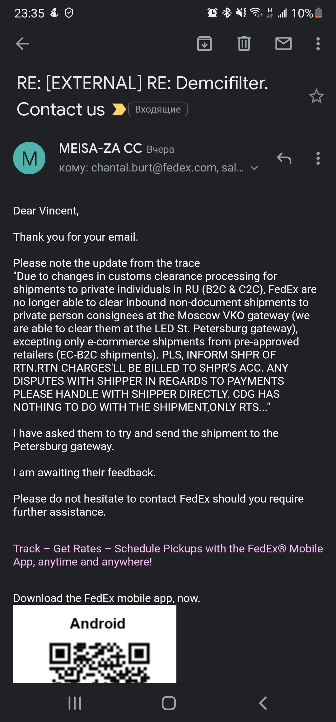+ 30 $ (в лучшем случае) ~ 70 $ на круг против 103 $ до двери, да и кто же об этом знал заранее. С Watercool же всё было ровно. В письме упоминание о неполном количестве/соответствии докуметации, у меня подозрение что это косяк demci, вложили не все сопроводительное/не попозиционный инвойс и т.п. => не проскочила посылка FedEx Москва (и соответственно не подключился на импорт gbs-broker), а не то что FedEx не работает с физлицами напрямую, это вообще не новость, он уже несколько лет не работает.