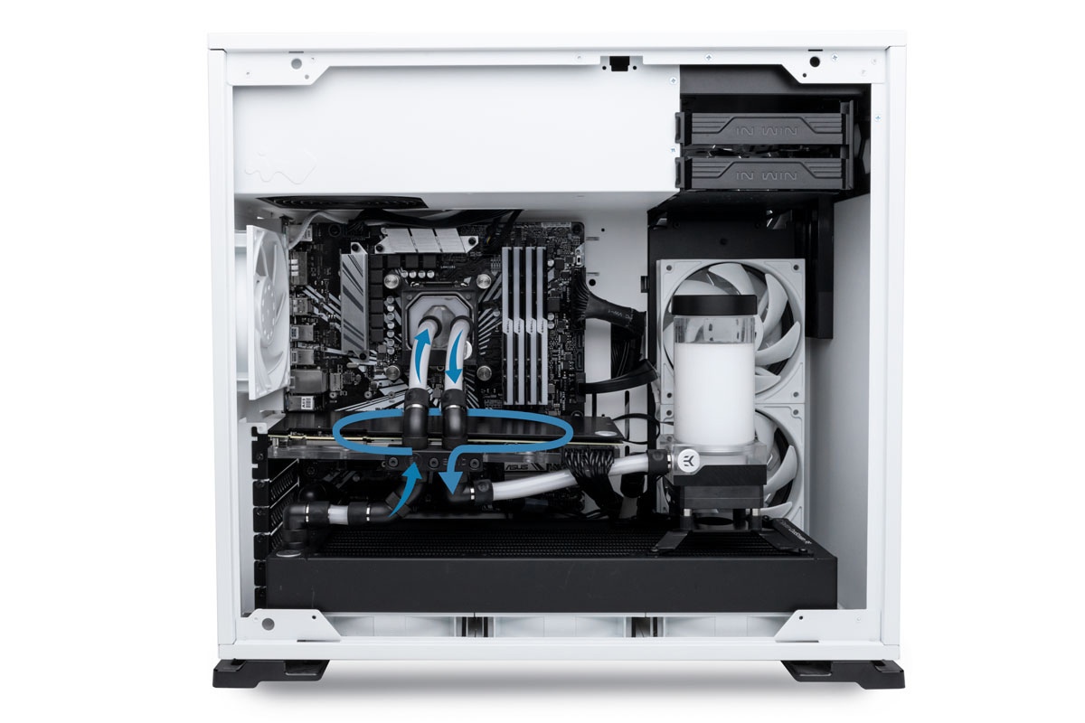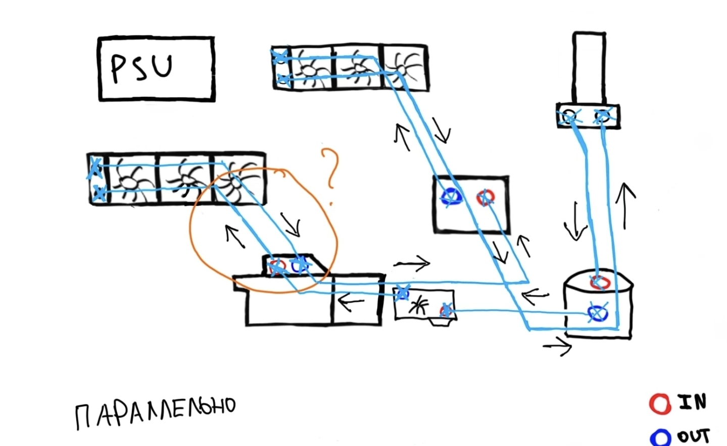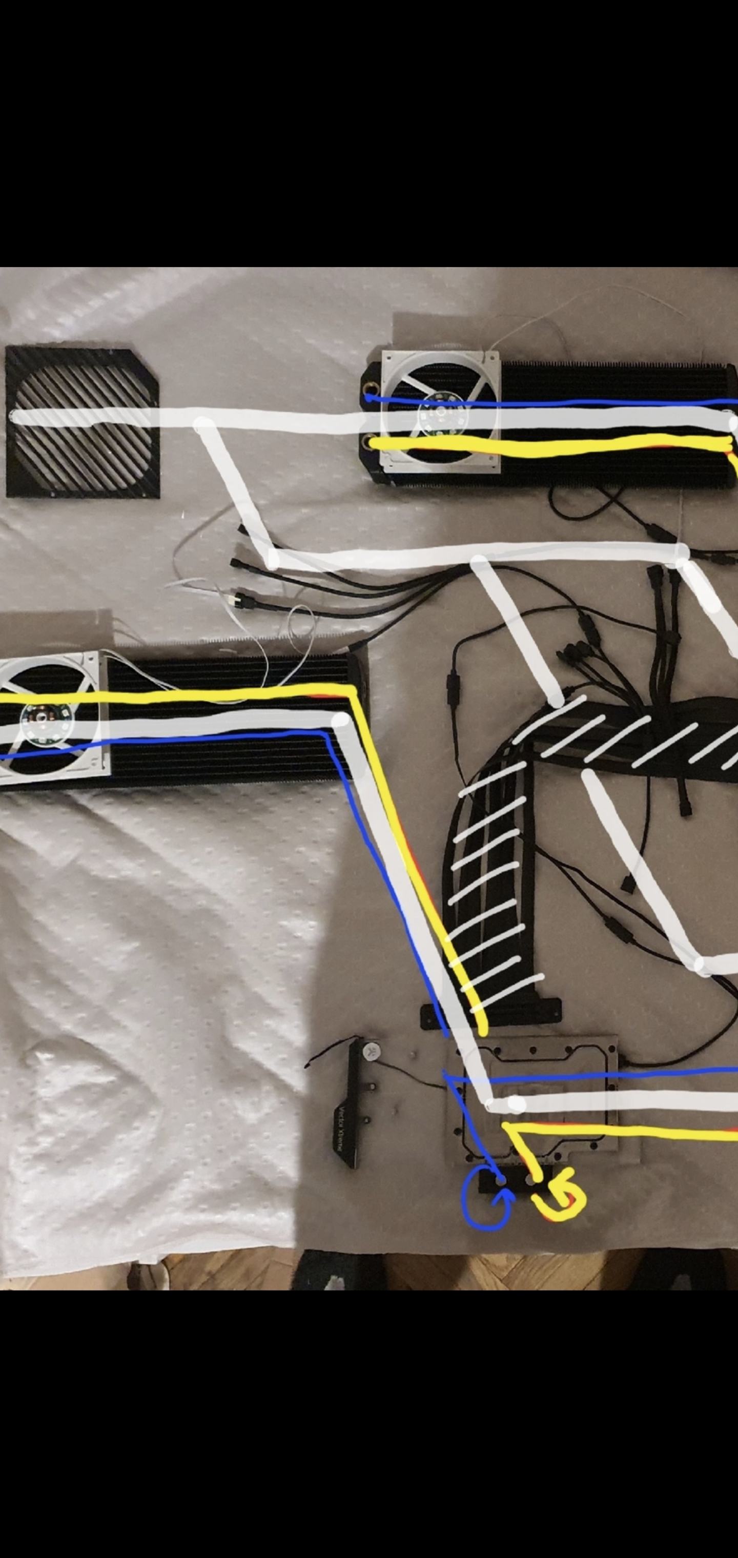 Белая линия-каркас Синяя линия-направление потока в сторону гпу от помпы Желтая линия-направление потока от радиатора в гпу