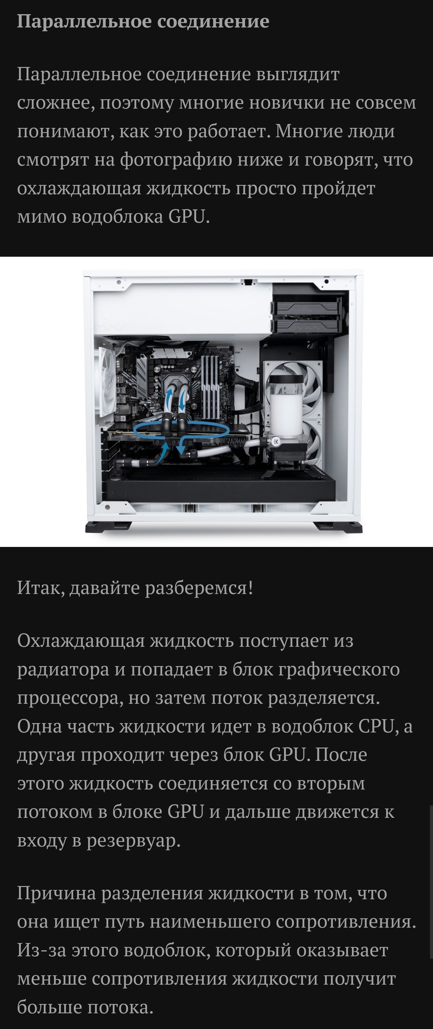 Тобишь смотрим на синию линию, поток по ней заходит в лицевой порт слева, и выходит из того же порта сзади, следуя в радиатор, далее из радиатора по желтой линии он идет в правый задний порт гпу и выходит из правого сверху далее следуя по контуру...