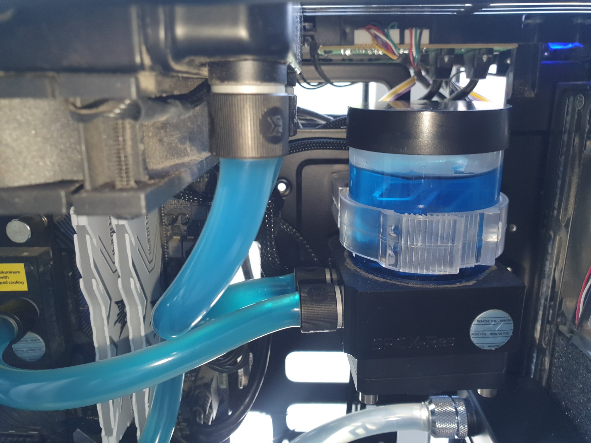 Иначе чем еще объяснить что вот эта помпа (качает контур проца) не создает тонну пузырьков на макс. оборотах (2600), точнее их просто нет. А до этого она стояла внизу и прокачивала два водоблока и два радиатора, и не жужжала.