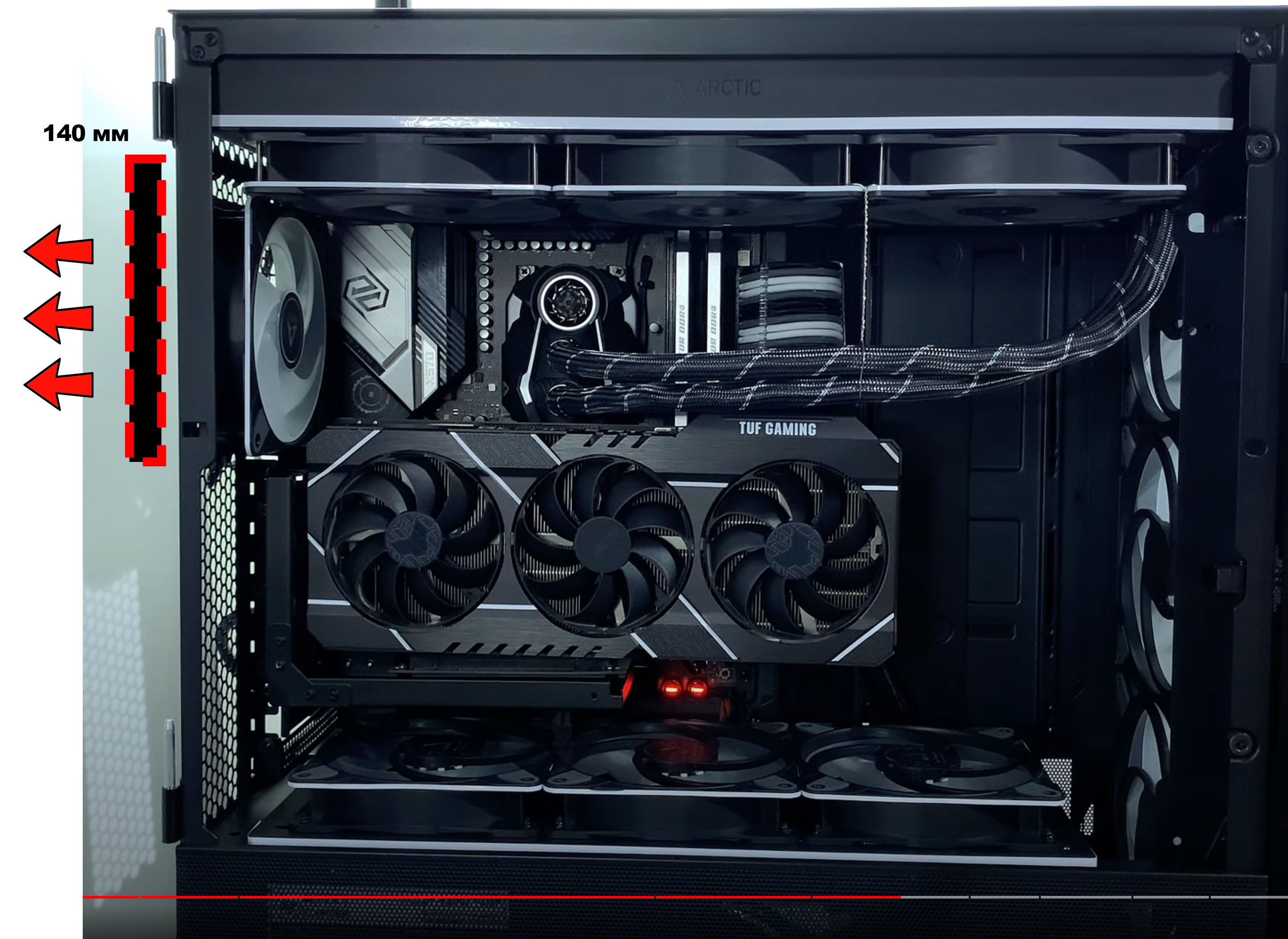 Корпус Lian Li LanCool 3 + Arctic Liquid Freezer II 420. Есть 2 варианта установки заднего вентилятора на выдув, 120 мм внутри корпуса или 140 мм снаружи.