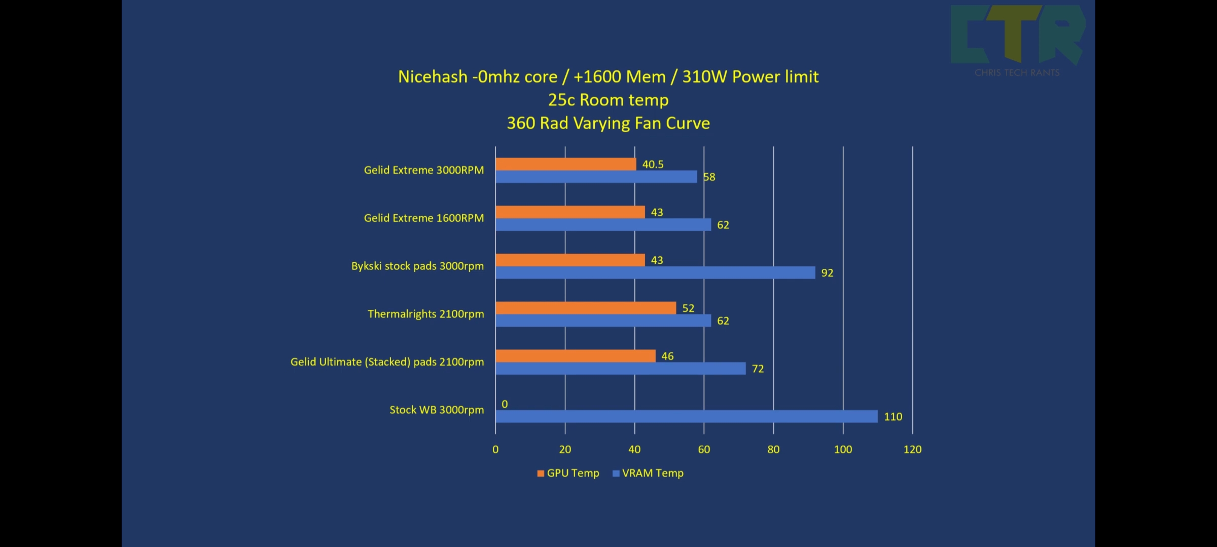 Прокладки на память снизу и сверху 1мм Thermalright, вода 37 градусов, помпа Д5 на самом минимуме. Итог 88-90 градусов память при 118мх и 315вт потреблении. Ядро 48 градусов.