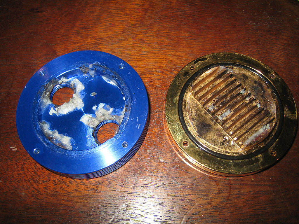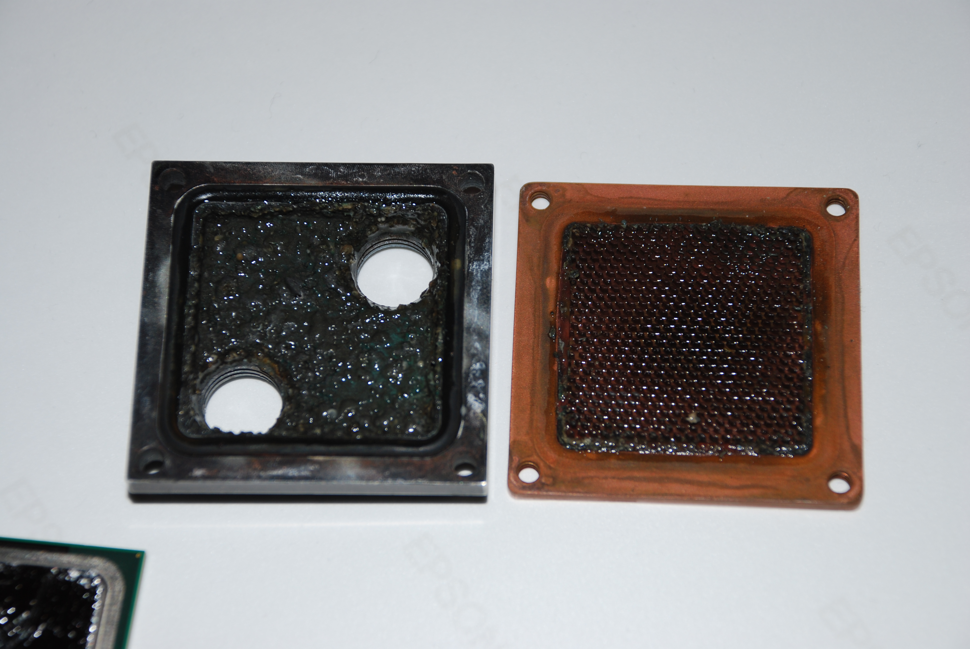 Чем у меня контур покрыт опять?)) Еще раз, для танкистов: белесая взвесь - это предположительно последствия спирта, добавленного при самой первой заливке обычной воды, который мог вымыть пластификатор из шлангов. После это было заменено на чистый дистиллят, но белесый налет на торцах ребер остался и при пристальном разглядывании виден, врать не буду. Мне лично он не мешает и на температуры не влияет, сама вода прозрачная, следов какой-либо коррозии ни на меди, ни на латуни, ни на припое нет. Но вы можете продолжать разглядывать мои фотки, сделанные на китайфон даже без протирания контура от пыли, и продолжать шептать свою мантру