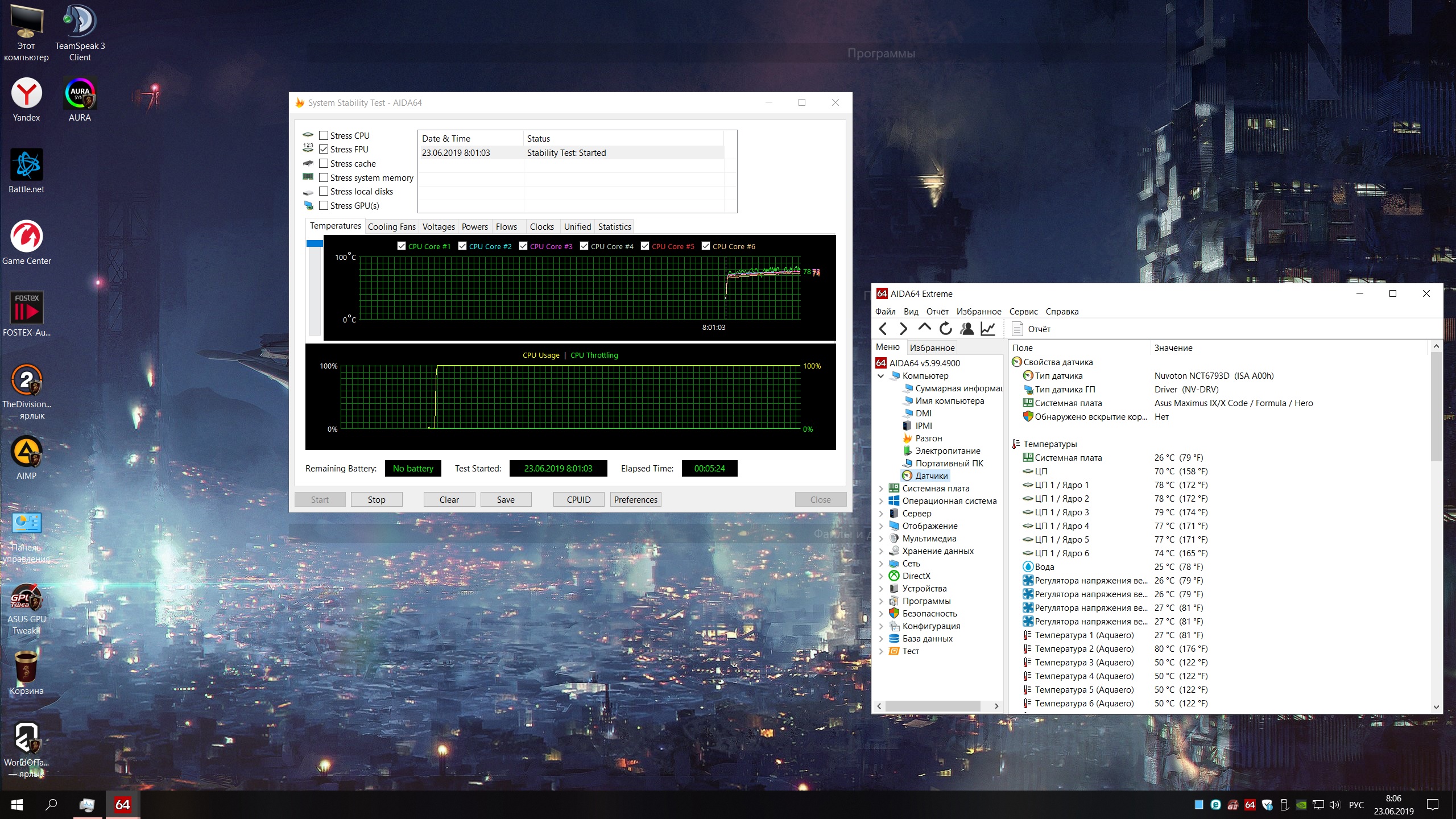 я вчера забыл что в настройках питания поставил все фазы проца в extreme и проверял как будет на 5 ггц себя вести в итоге на 10 градусов выше темпа стала по итогу дня..седня переключил в положение стандарт когда количество фаз питания регулируются процессором как итог получил минус 5 градусов по максималке на fpu и она составила 81 градус,15 минут лень сидеть ,там по графику 5 минутному итак все видно ,что на 5 минутах, что на 15, будет тоже самое с погрешностью в 1 градус по воде и темпе.Вентили там все равно сколько ставить от 1200 до 1500 результат один и тот же я обычно 1200-1300 ставлю(я вентили на проц с реобаса кручу не показать на скрине никак) .Отчетливо слышу звук часов на 5 метров от компа.Но не надо забывать что я счас вообще тестил с памятью 3866 т1 с мего ужатыми таймингами ..и кеш задран .Попробуй свой проц погнать хотя бы до 4800,что бы можно было как то сравнить.А и да температура 2 на акве в аиде это максимальное значение температуры на проце, совфверный датчик.