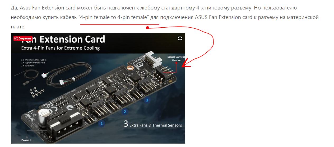Господа, я не очень уверен, китайское комплектующее ли это для сво, но использоваться оно будет именно так и заказывать я это планировал из Китая. История такая: Достался мне FAN EXTENSION CARD от ASUS с проприетарными разъёмами подключения для плат Asus. Плата у меня Asrock, разъёма нет. Товарищи Asus говорят - "Asus Fan Extension card может быть подключен к любому стандартному 4-х пиновому разъему. Но пользователю необходимо купить кабель “4-pin female to 4-pin female”"... Может кто из вас, гуру китайских магазинов, находили сей кабель “4-pin female to 4-pin female”? Потому как я уже часа 2 не могу найти ничего. Ситуация усугубляется тем, что я даже названия адекватного этого коннектора найти не могу. P.S. буду как раз использовать эту плату для втыкания термометров на резьбе G1/4 в свой контур... Надеюсь, возможно будет вывести данные не на плате асус с этих термометров. С контроллером есть ещё пару .. эм.. термометров. Но их в воду, я так понимаю, лучше не пихать)
