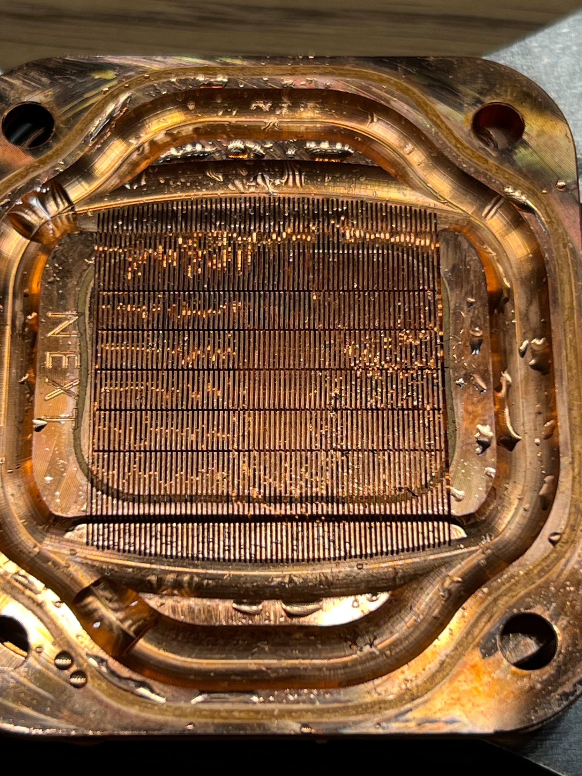Вообщем сменил я термопасту с ТГ на апекс от альфакула, поставил крепление от аквы со смещением блока влево. Температура упала на 5 градусов, теперь 90 вместо 95 и температура гораздо медленней и равномерней растет, не как тогда за 4-5 сек 90 и еще за следующие 10 сек - 95. Сейчас гдето секунд 30 поднимается до 89-90 и там ее плющит туда-сюда на 1 градус. Аида при этом держится 79-80. Стало и холоднее и равномерней, может проблема была в термопасте тк снял водоблок а основание все поцарапано термухой, хз как это приключилось. Кароче протер и поставил обратно. Вот несколько фото.
