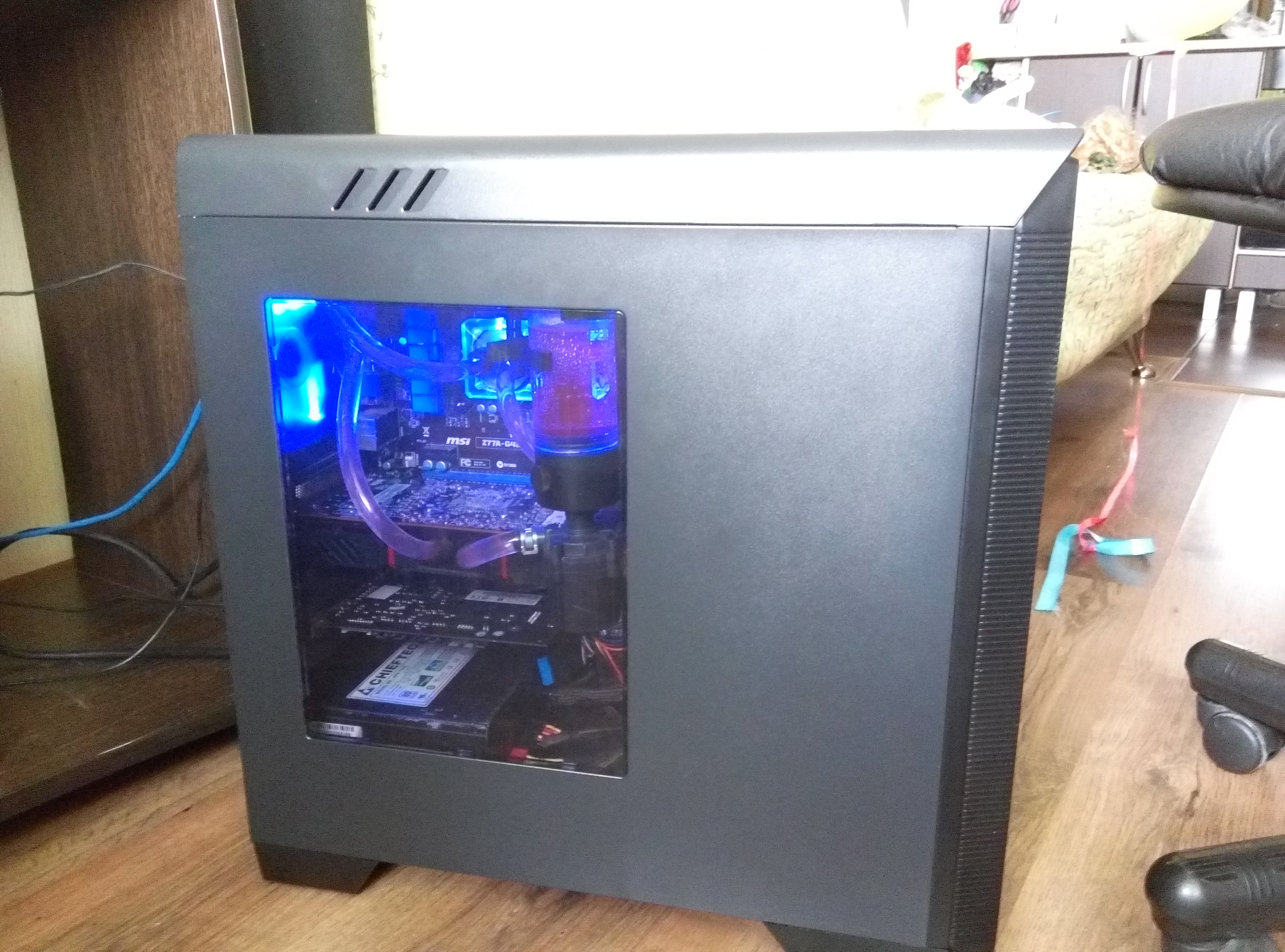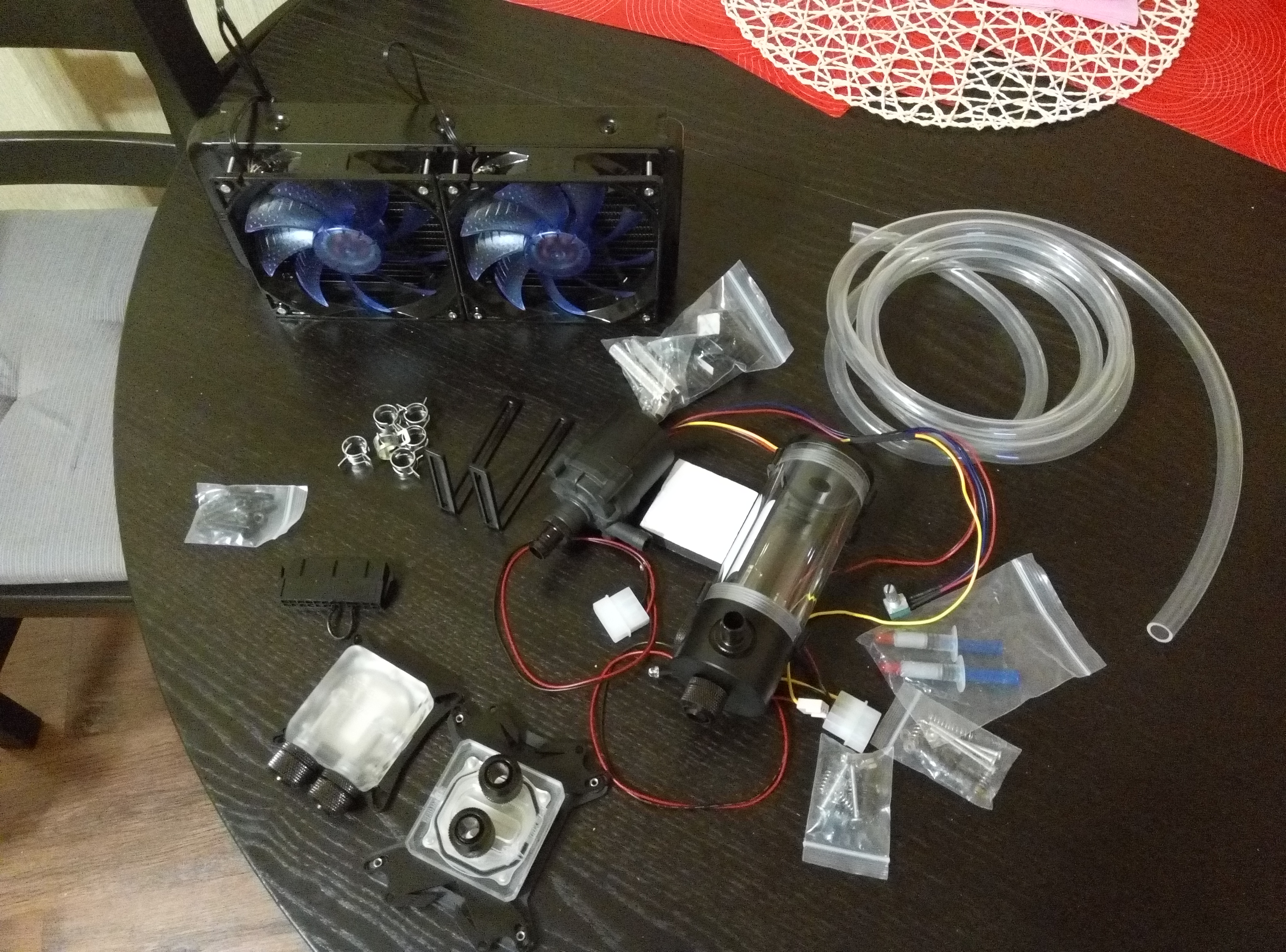 Набором кстати подешевле выходит. я такой вот взял (цена была 7500) http://ru.aliexpress.com/item/Bykski-CP ... 03608.html Все установил, работает без нареканий, охлаждает i5 3550 без разгона и R9 290 тоже без разгона. Но одного радиатора явно мало, поэтому заказал еще один похожий алюминиевый радиатор 280мм (больше и толще в корпус уже не влезет). Помпу сначала поставил на дно корпуса на мягкую подушечку (от продавца кстати пришла, удобная штука. он вообще в этот комплект вложил все что необходимо и даже пару лишних фитингов), но после смены корпуса все переделывал и решил помпу жестко к резервуару закрепить, читал что шумит она в таком состоянии, но все равно сделал. Не врут, действительно гудит, но благодаря регулятору можно найти нужные обороты, на которых гула нет вообще (около 4000 у меня).