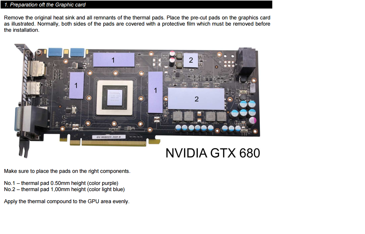 Всем доброго времени суток! Имеется ватерблок и видеокарта Palit GTX 770: #77 Купил термопрокладки толщиной 0,5 и 1 мм. Какие и куда клеить? Особенно интересует элемент, отмеченный стрелкой.