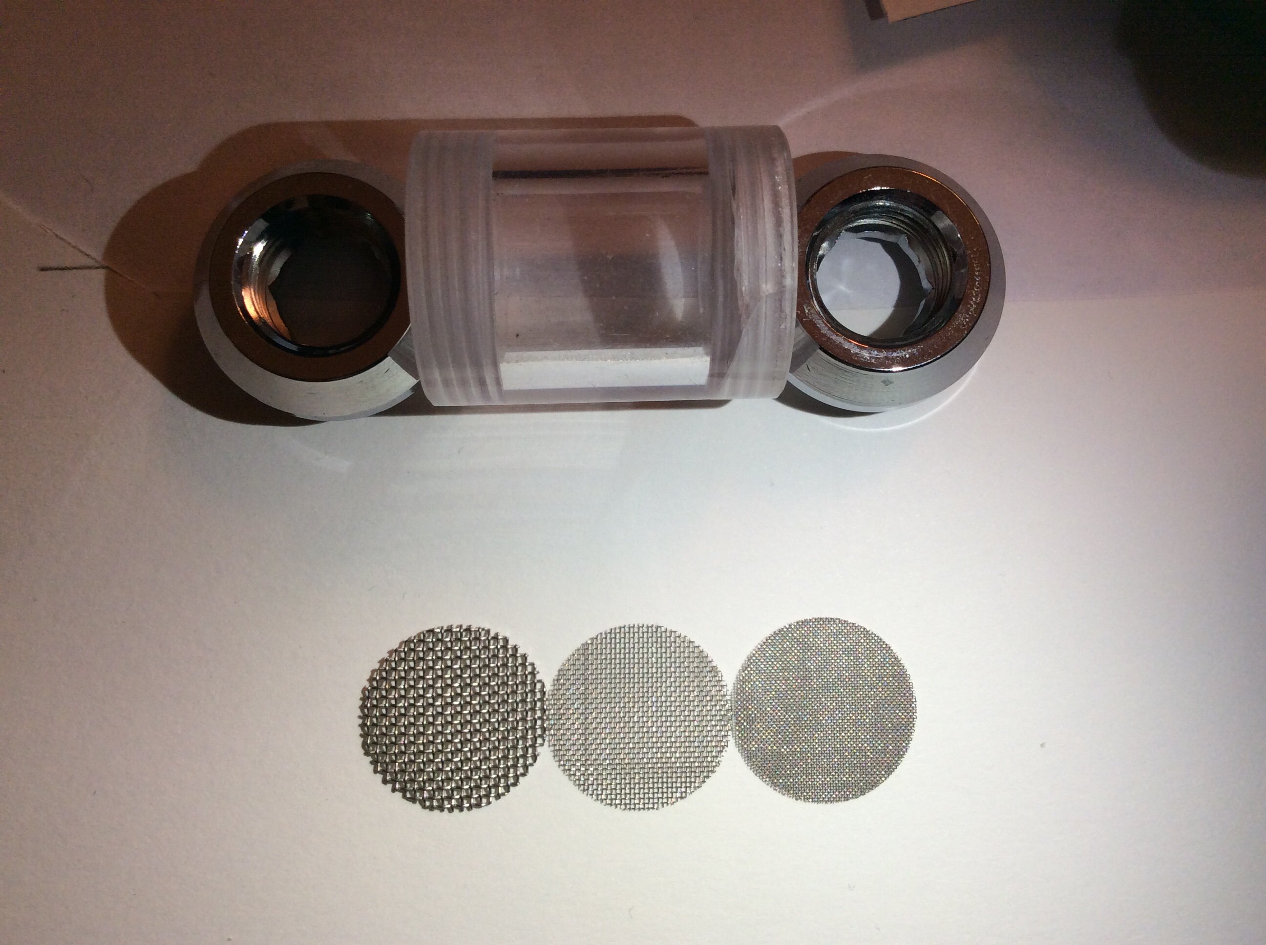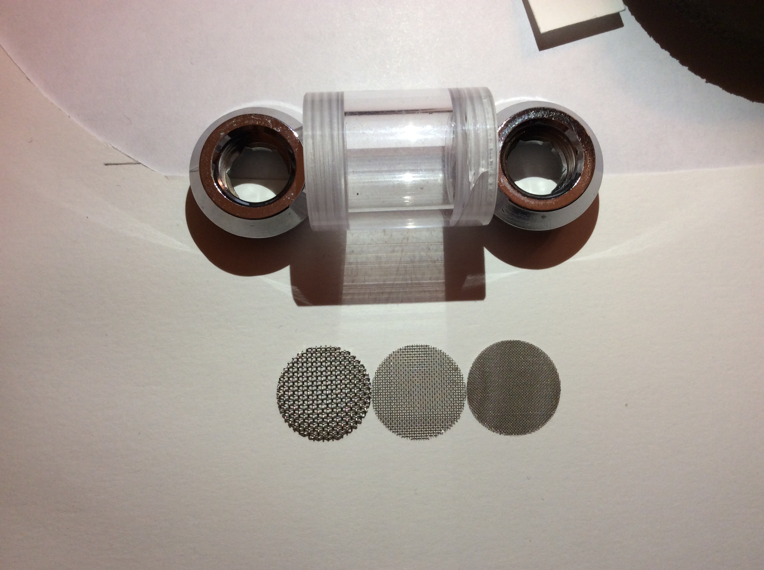 Это опять же, самая крупная сетка из набора. В ней действительно толку ноль, разве что стужку какую поймать от плохо почищенного POM топа или резервуара. А вот средняя и самая мелкая вполне себе ловят мелочь всякую, не позволяя ей забить микроканалы, хотя бы после сборки.