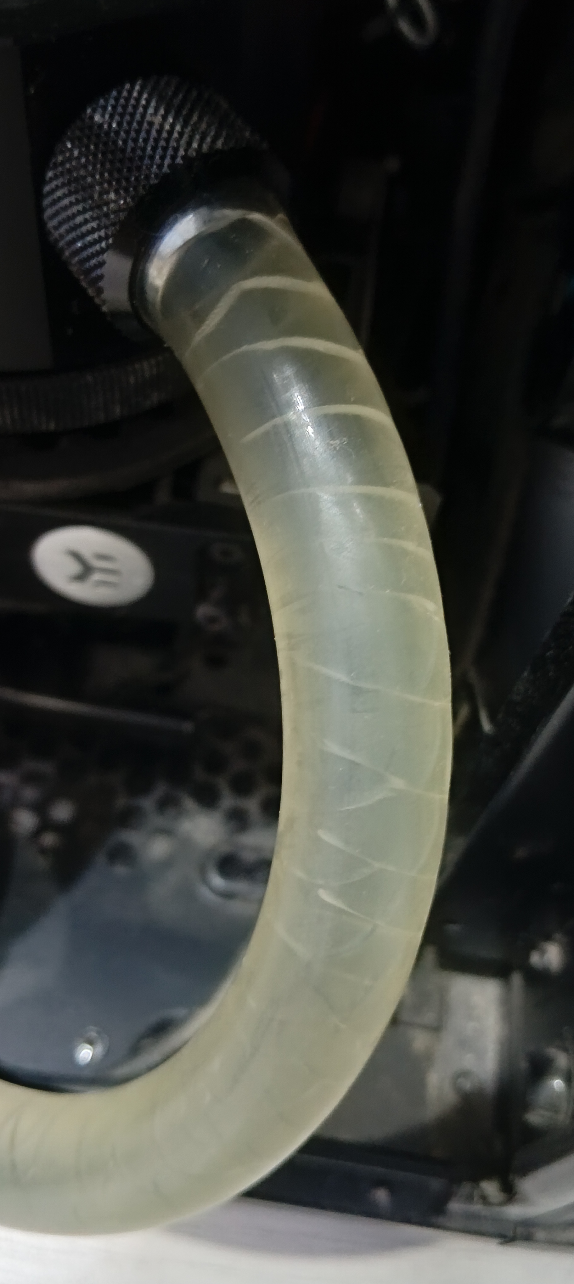 Года 4 назад брал 10/16 прозрачные ПУ шланги от barrow. Довольно жесткие, непросто гайки затягивать. Первое время цвет/прозрачность оставались в норме. Ну и собственно последние года 3+ контур не трогал. Вчера убирал GPU водоблок из контура и довольно сильно крутил/загибал некоторые шланги. И вот как оно выглядит после таких манипуляций.