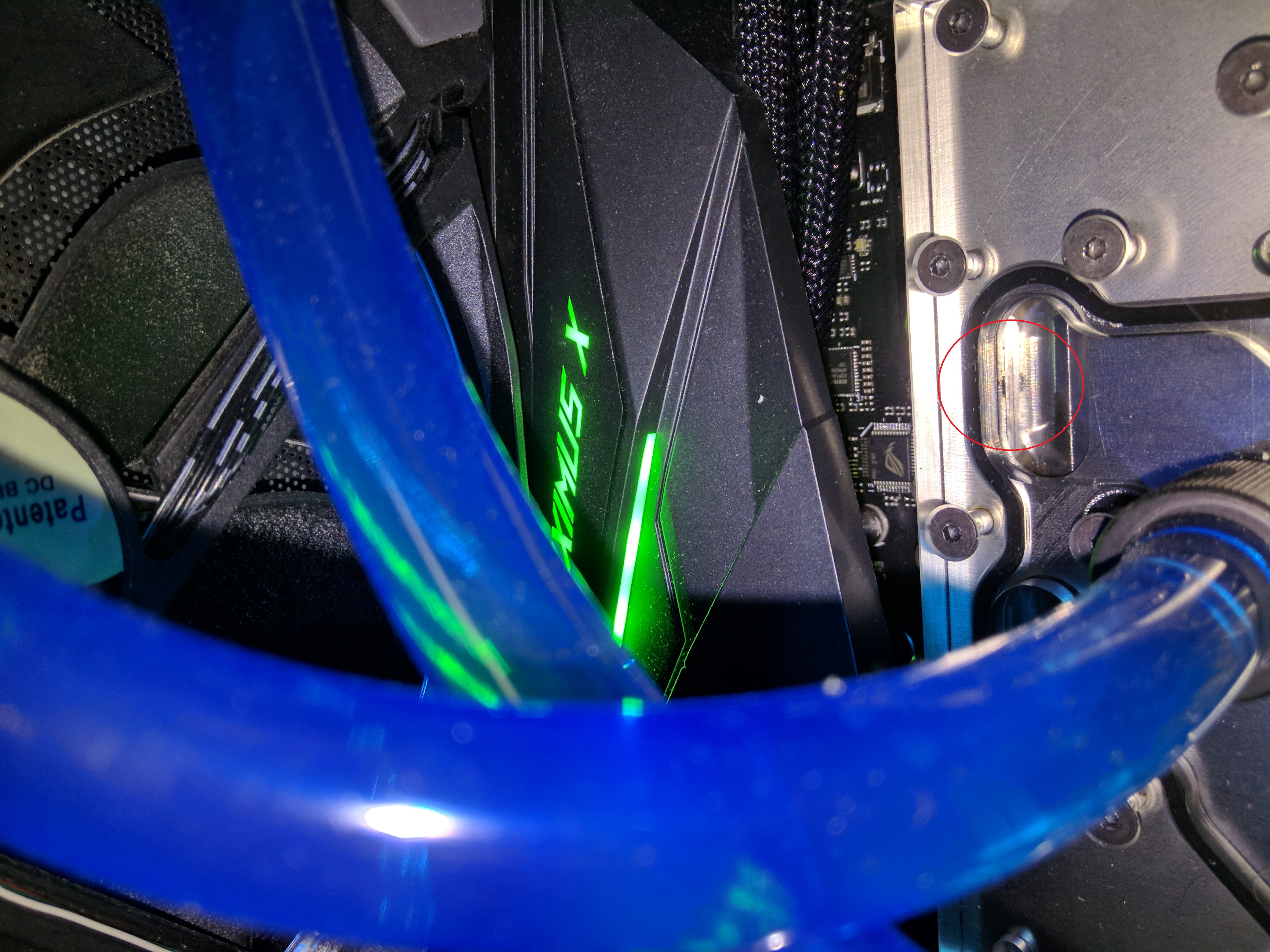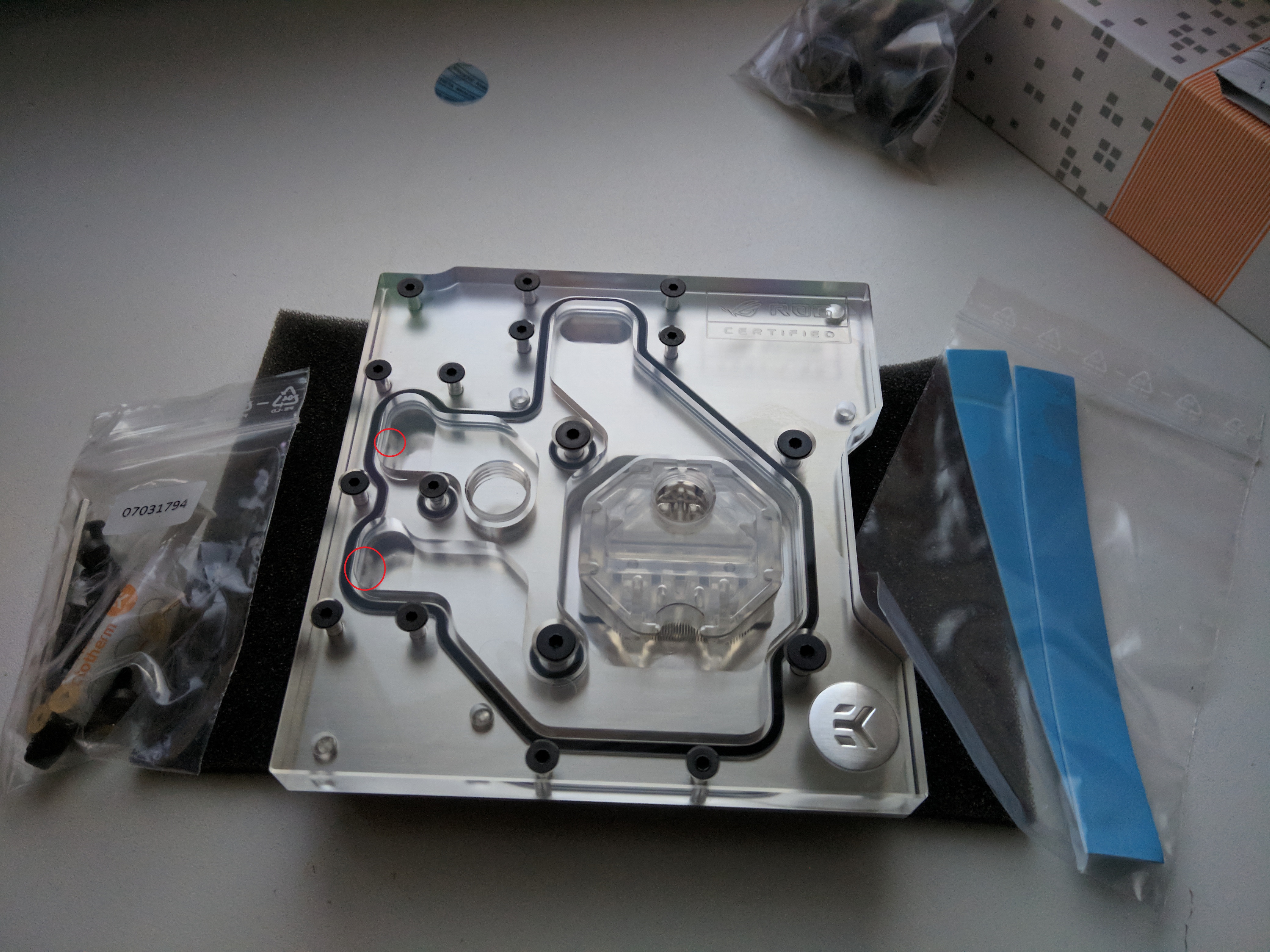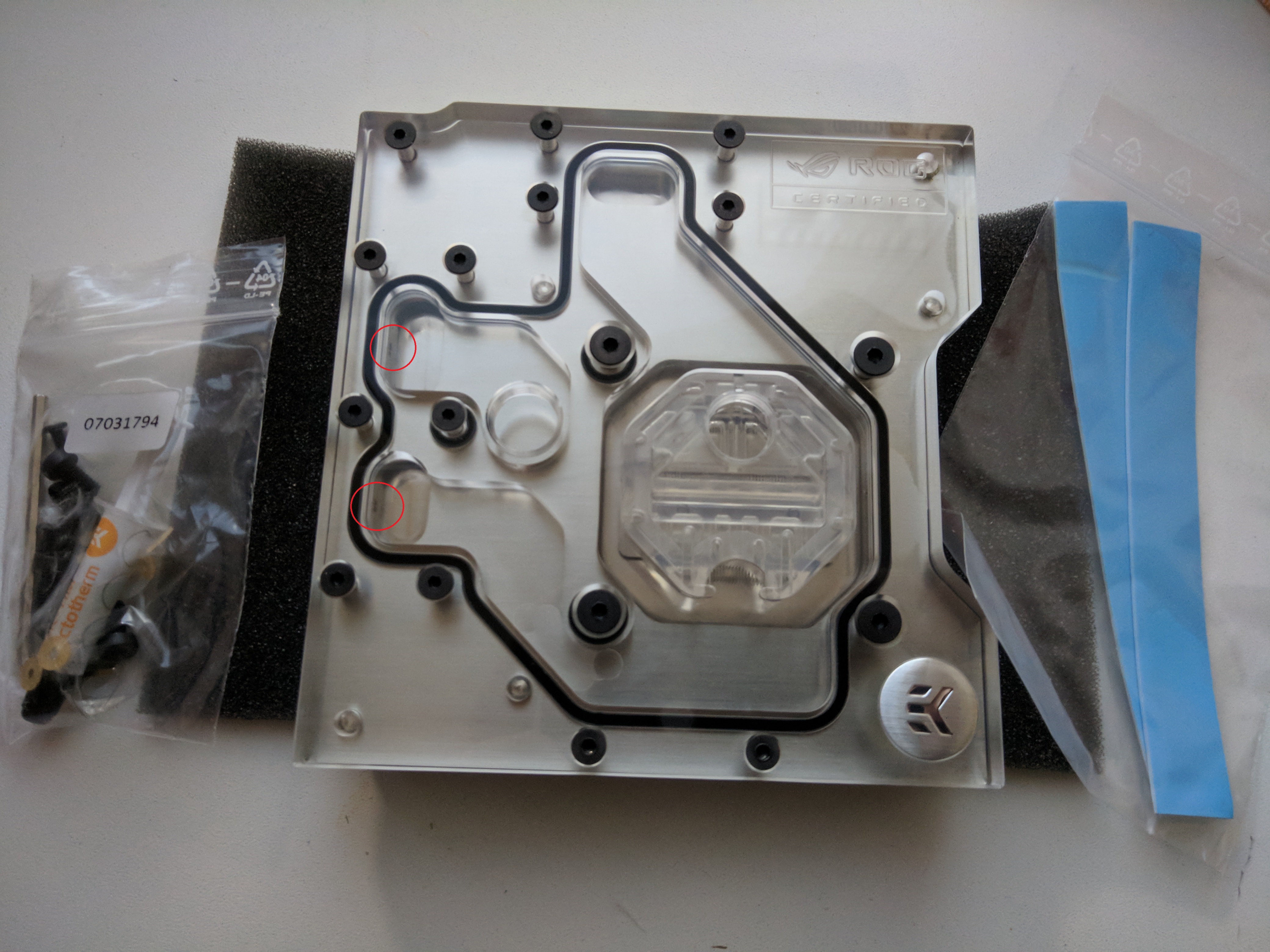 В общем, разобрал водоблок, пощупал - действительно, следы коррозии какой-то, как-будто подгнило или разрушилось покрытие в этих местах, неровность ощущается. Еще и 3-е место коррозии обнаружилось в другом отверстии. Это все отверстия водоблока VRM..