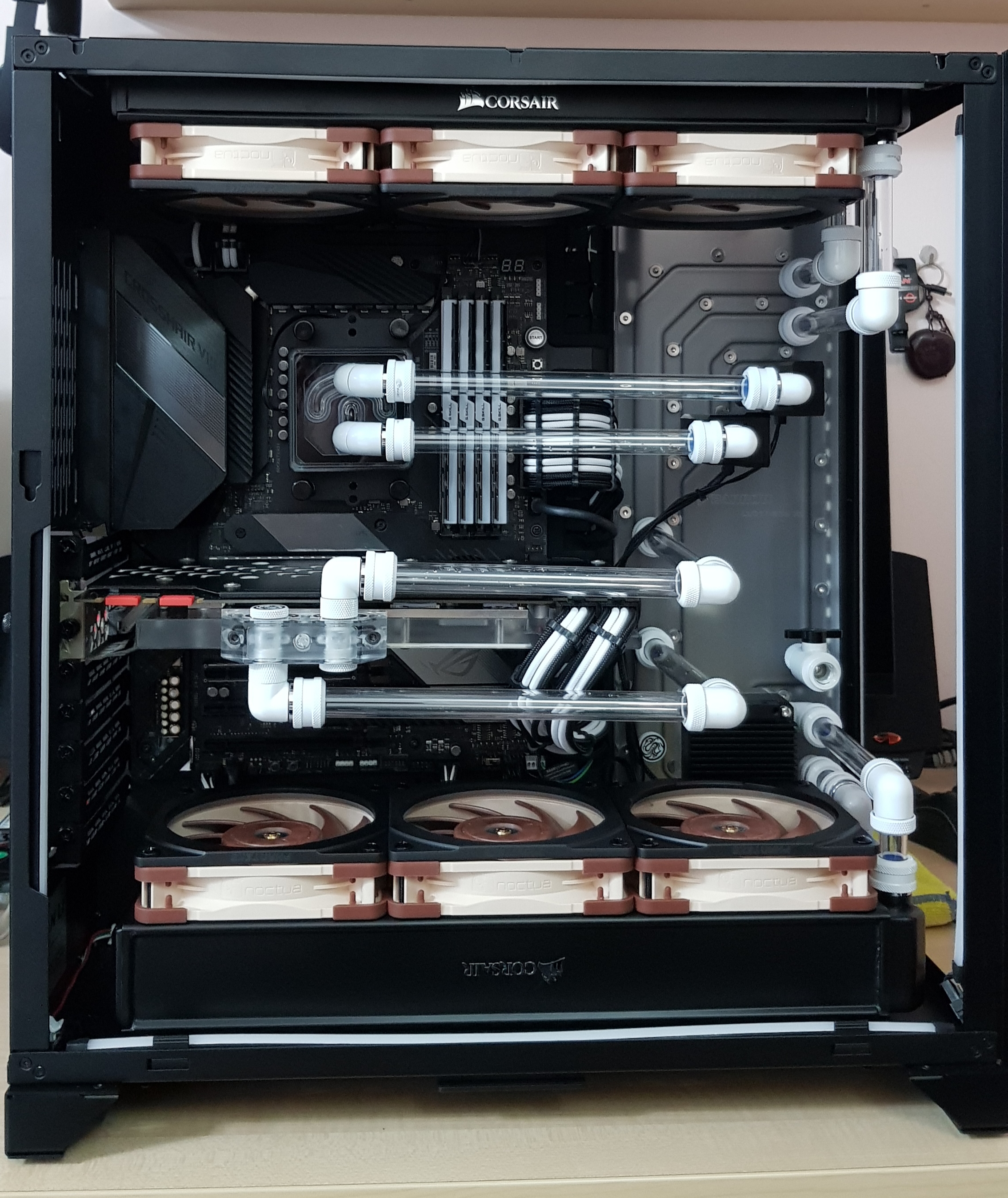 И в чем проблема? Делается все так же как у меня в эскизе, исключая третий вертикальный радиатор, только докупается gpu vertical mount (даже специально для этого корпуса выпущено это крепление:https://lian-li.com/product/o11dxl-1-vertical-gpu-bracket-kit/), организуя поток снизу вверх (но в вертикальной плоскости с S-образным прохождением через gpu) в последовательности выходом из active back. Вход в помпорез можно поменять (не от cpu, а через верхний радиатор).