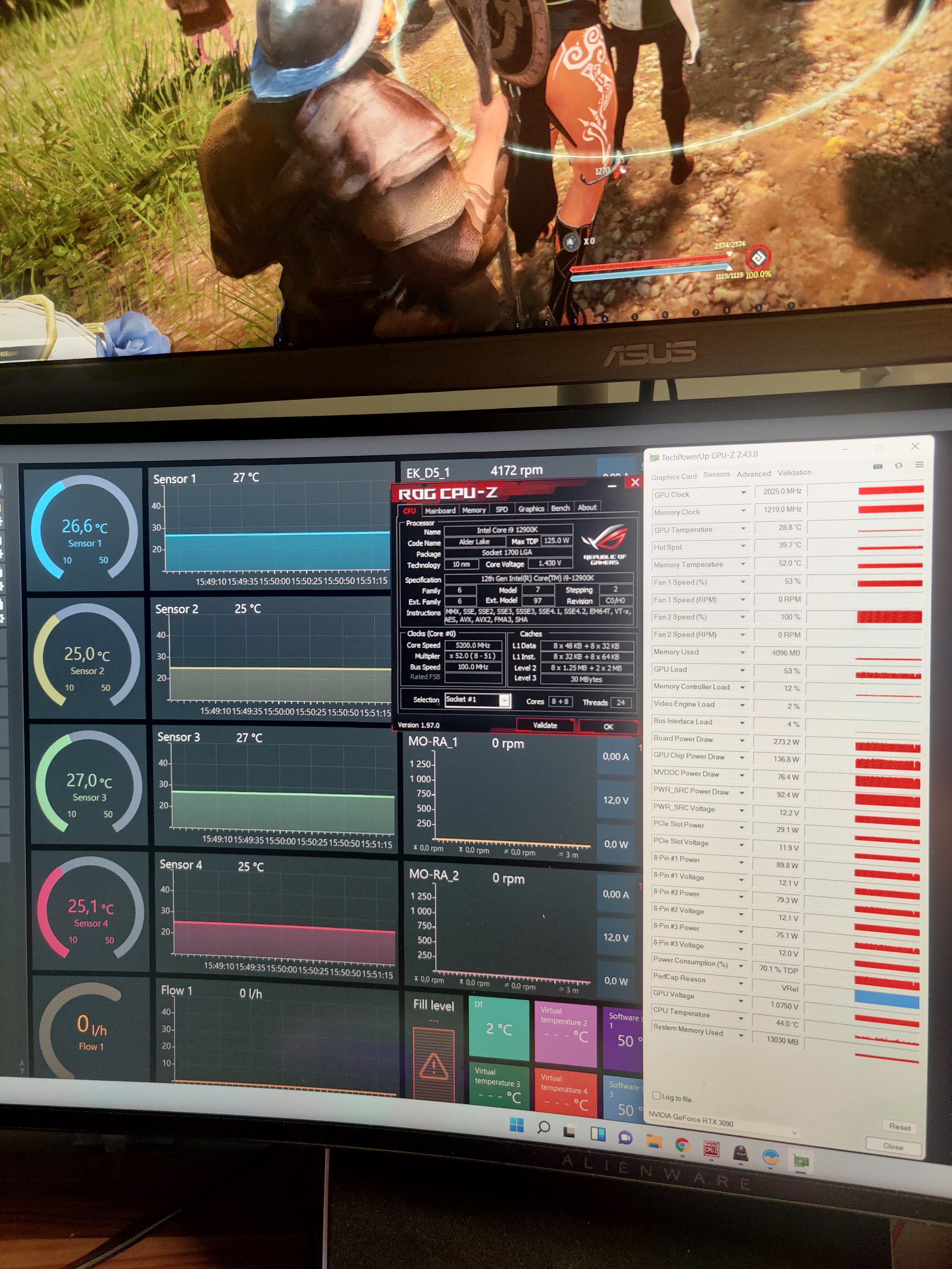 Собрал я всё в общем, пока времени не было, разгребаю бардак после себя, винда тоже с нуля, ничего ещё не установлено 5 помп даваят максимум 236 литров показания с некста Не досмотрел мануал первый m2 делит линии с первым же псиех, из за этого видео работает в режиме х8, не знаю насколько это критично но чтобы вынуть м2 надо разбирать все снова включая водоблок матери, забил пока Хмп 6000 не стартует, драйверы vdm диски не видит, и вот эти ограничения по раскладке линий с проца немного напрягает после проф платформы, где можно было сувать все что хочешь Дабы совсем не уволить пост в оффтоп добавлю фото в режиме моей игры бдо Сенсор 1 и 2 вход выход из радиаторов 3и 4 просто дублируются