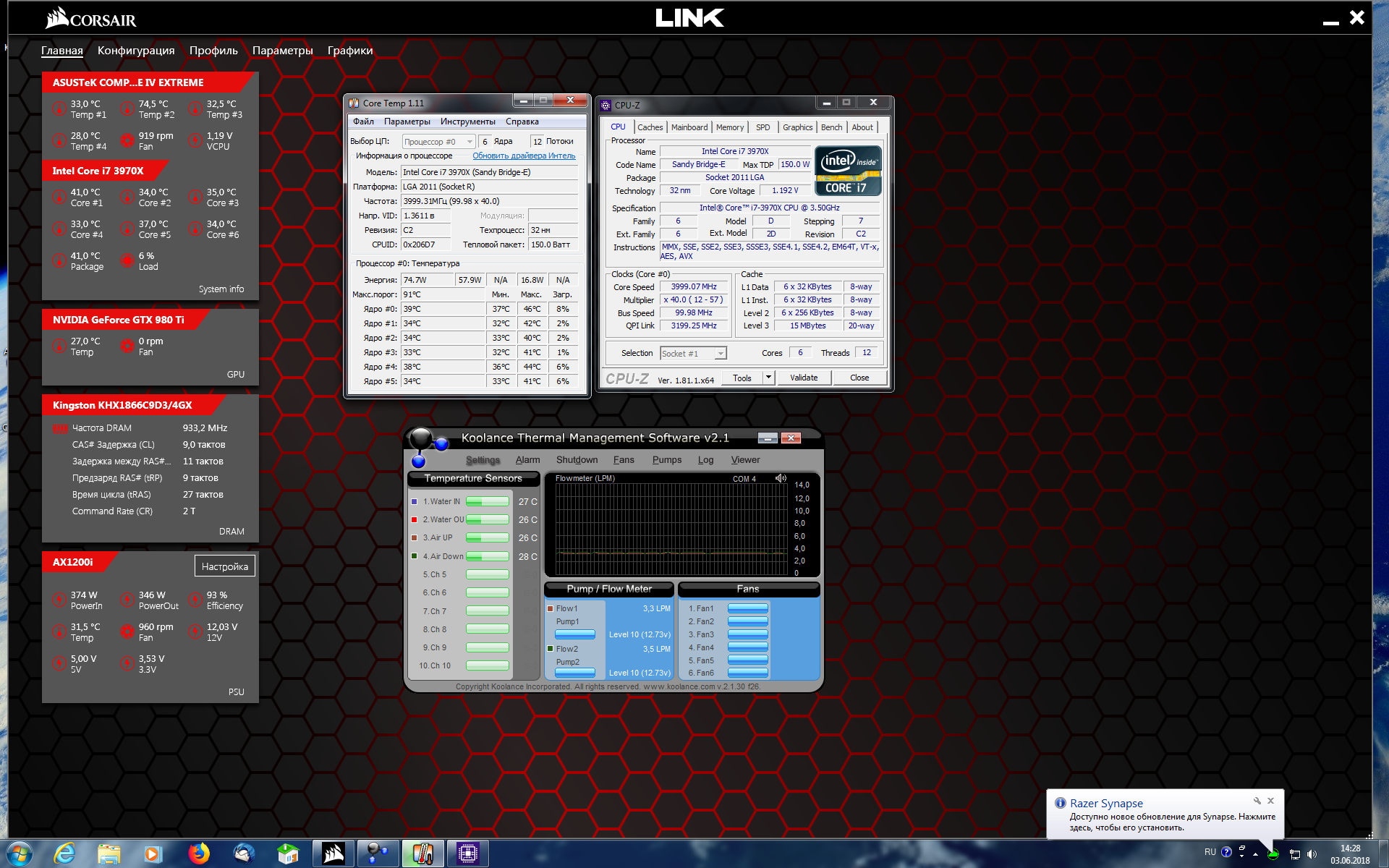 1. 4помпы 2. 3помпы 3. 2помпы 4. 1помпа В контуре 5 водоблоков (mb 2шт, процессор, видеокарта, рэйд контроллер) + 2 датчика потока от Ку fm16, + 2 температурных датчика жидкости от Ку,+ резервуар Ку RP452X2, +топ для 2 помп EK-D5 Dual, + 2 быстросъема от Ку, + Mora Lt360 скрины без нагрузки, под нагрузкой выложу позднее