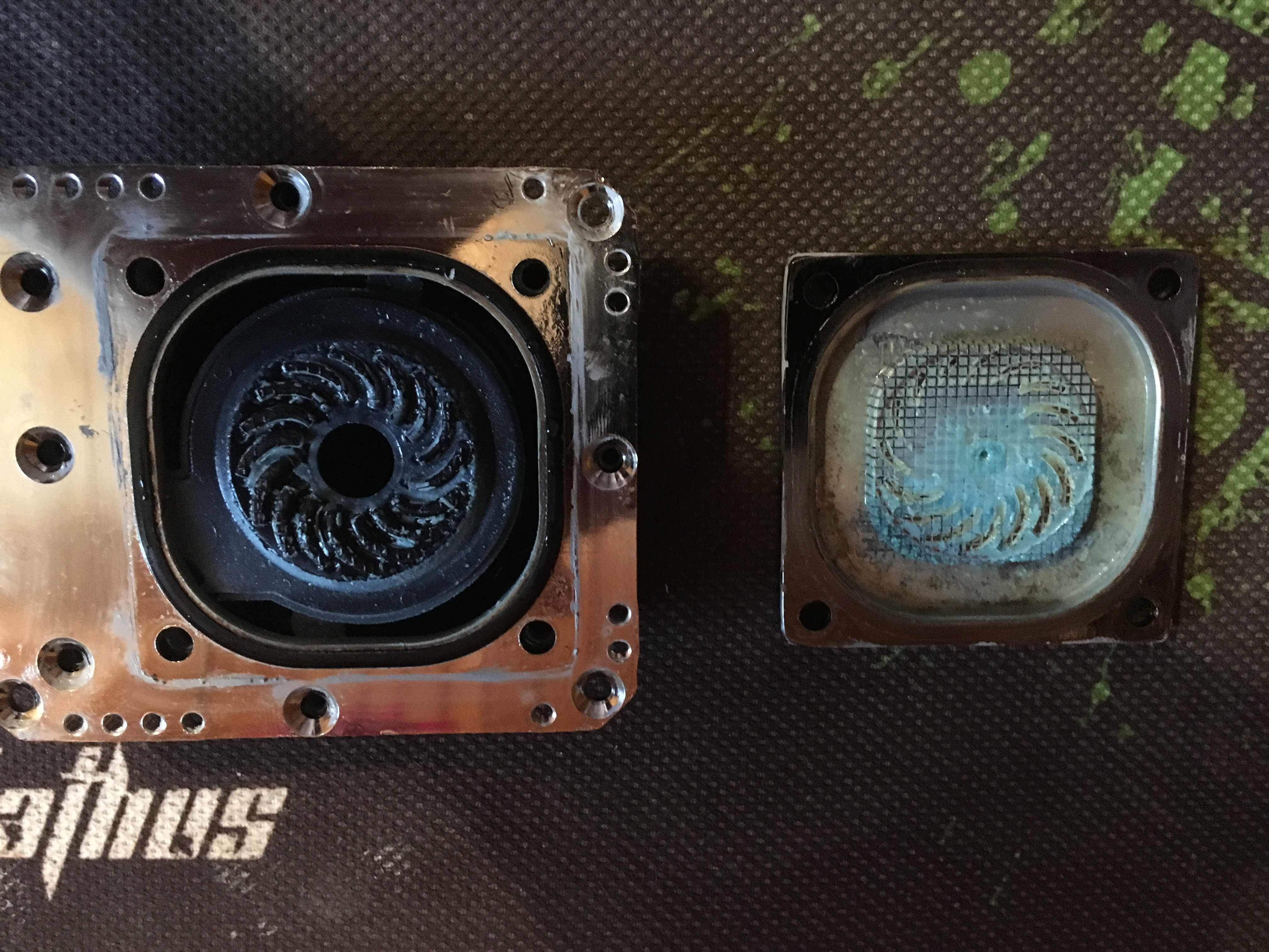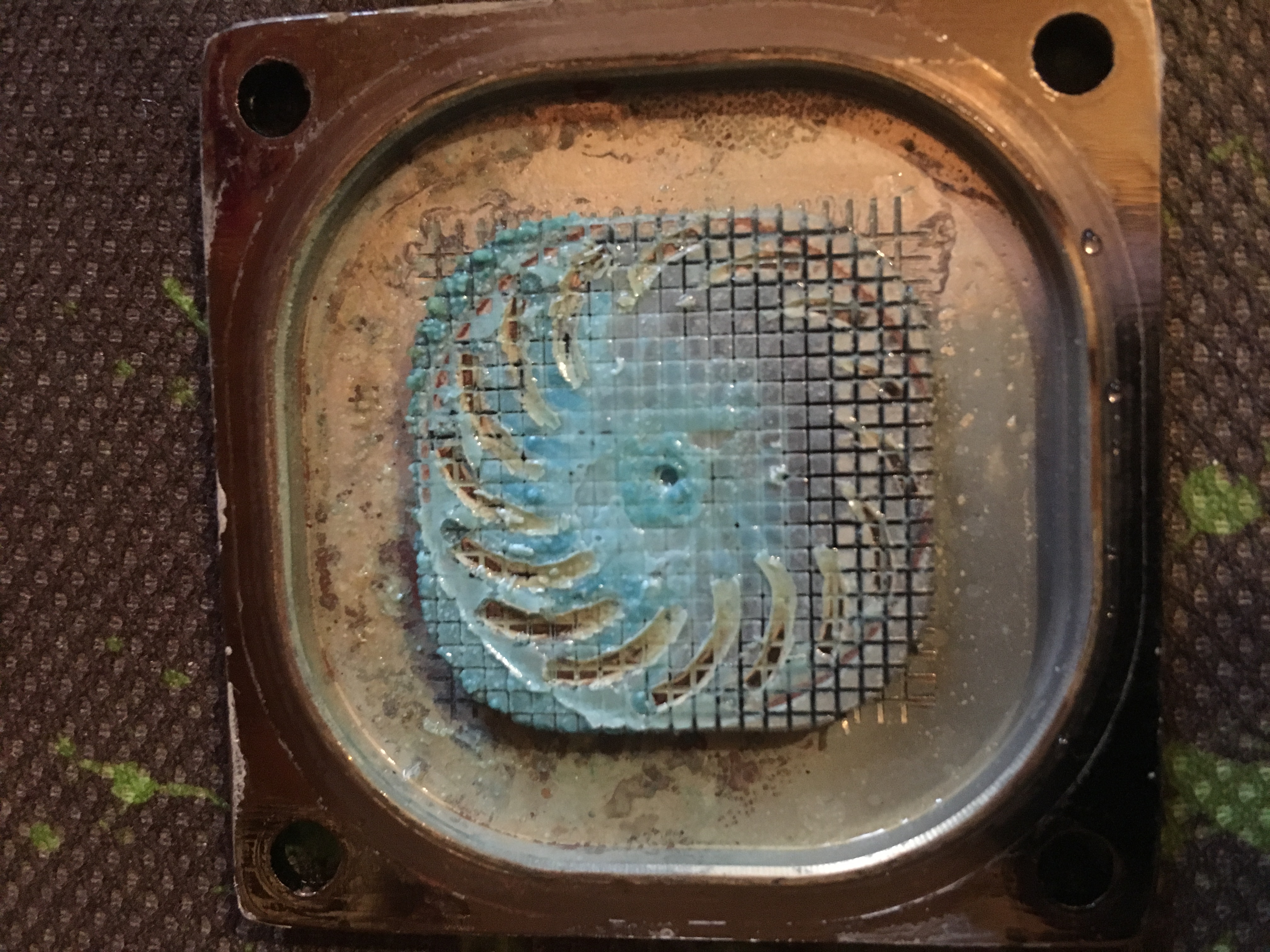 И не удивительно, что сдохла. Это осадок от alphacool хрени, которая была с завода залита. Помпа физически не могла крутиться, похоже сгорела.