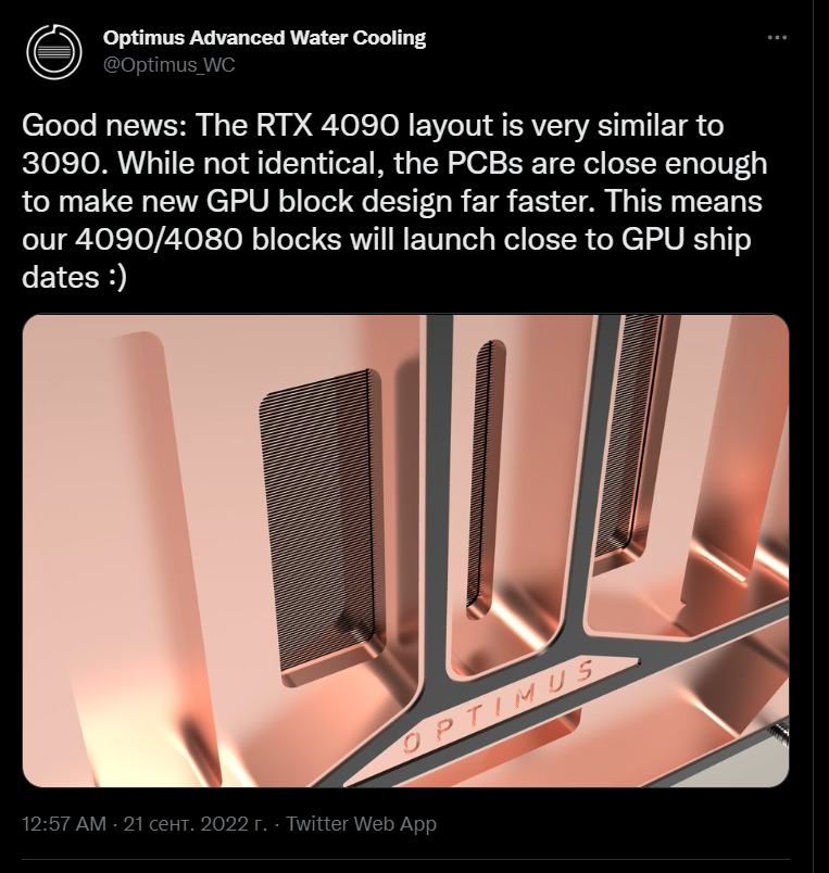 Чисто визуально по скринам PCB и судя по тому какая куча водоблоков и AIO вылезли еще до старта продаж 4090 я бы предположил, что водоблоки от 3090ti подойдут к 4090. В случае стандартной PCB конечно.