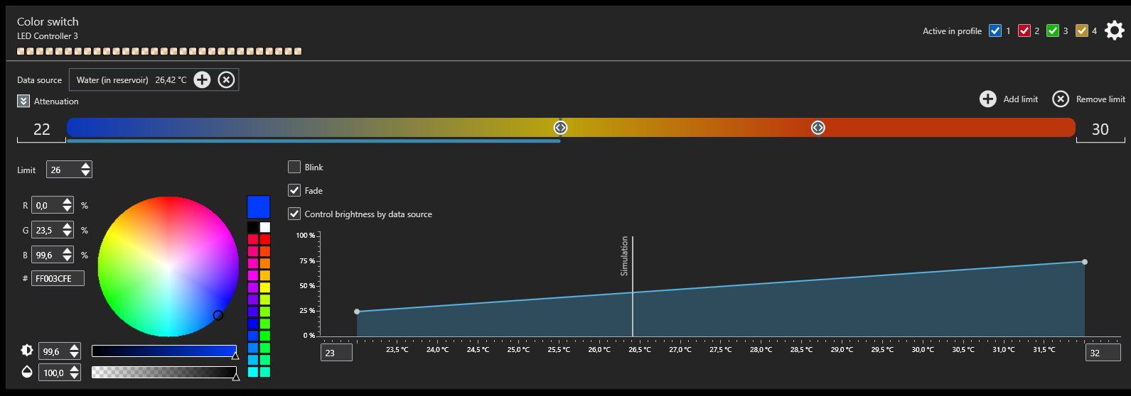свистоперделка - синяя, нагрелась - красная, или обороты помпы поднимаются - огоньки быстрей бегают? Так реально?