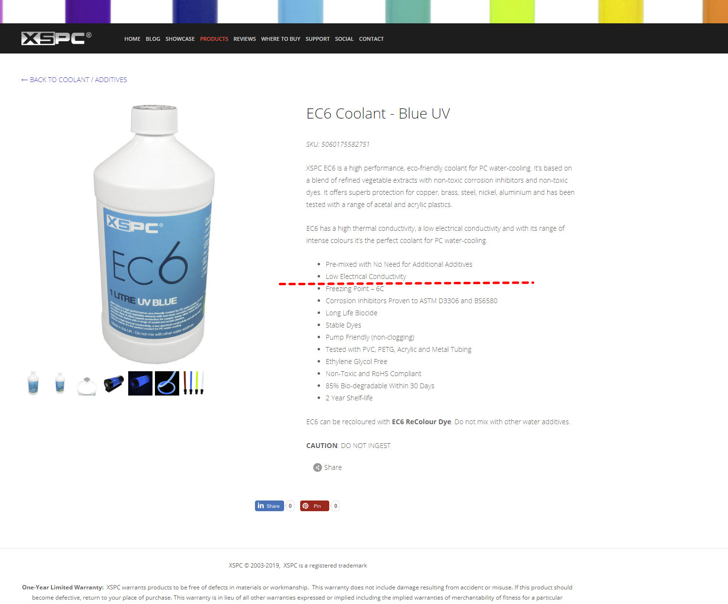 EC6 XSPC Details: • Pre-mixed with No Need for Additional Additives - Ships ready for use • Corrosion protection for Copper, Brass, Steel, Nickel and Aluminium Proven to ASTM D3306 and BS6580standards • Prevents build up of Algae & growth within in your liquid cooled system • Electrical Conductivity <2µS/cm at 24C * (most competitors struggle to reach <10µS/cm) • Non-Toxic and RoHS Compliant • Freezing Point - 6C • 85% Bio-degradable Within 30 Days • Available in a None coloured option or an expanding range of *non toxic UV colours • Shelf Stable UV Reactive Dyes of up to 2 years • EC6 is a true Eco Friendly Product