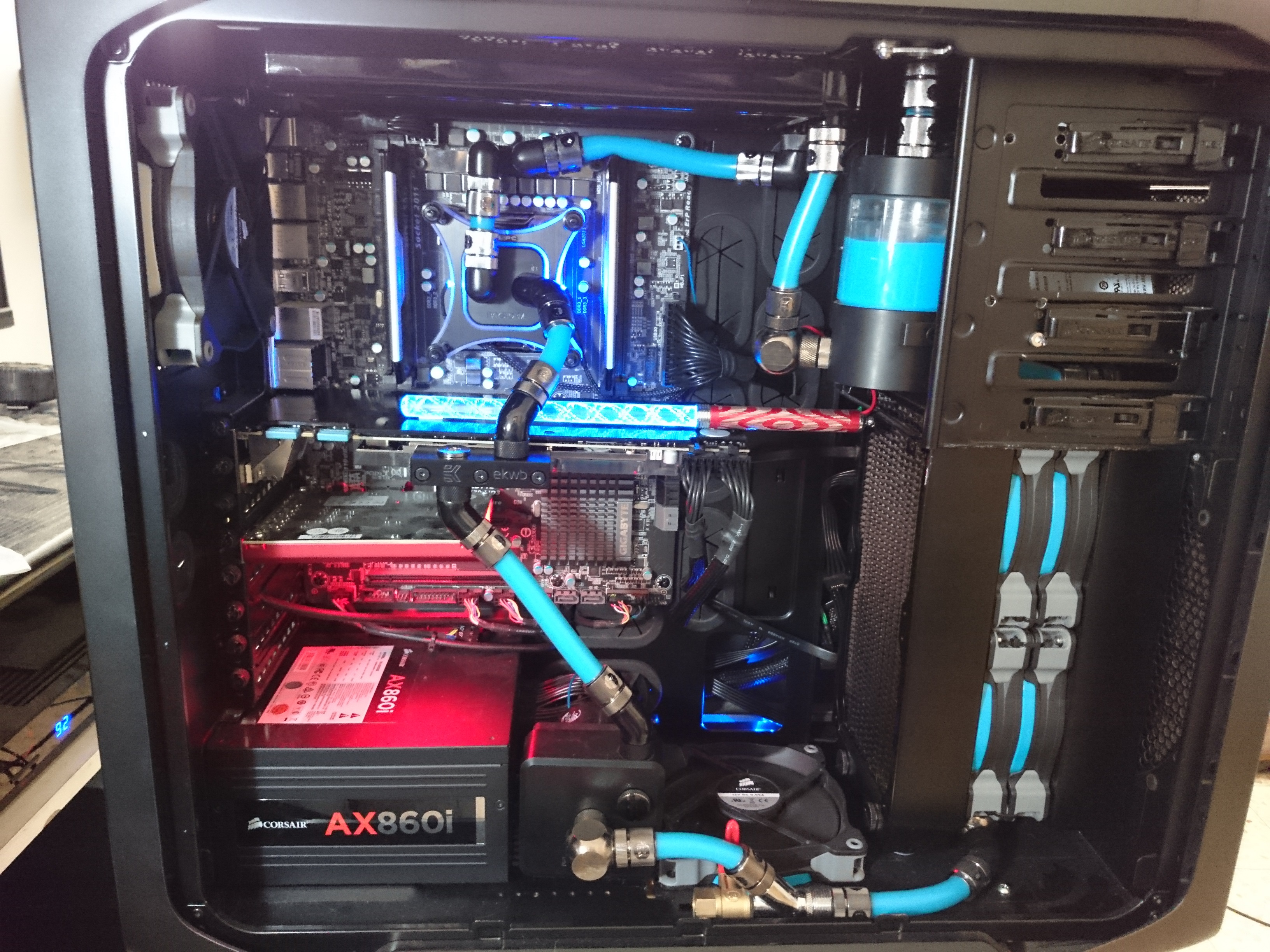 Собрал китайскую воду с пол пинка на 970. На GPU EK Thermosphere, на VRM самодельный блок. В простое 22 градуса, в нагрузке 32 при полном разгоне в штатом биосе. Мегагерц не прибавилось ни сколько не смотря на то что было скинуто 30 градусов по сравнению с воздушным охлаждением которое стояло до этого. Печаль, видимо нужно модифицировать биос и повышать напряжение.