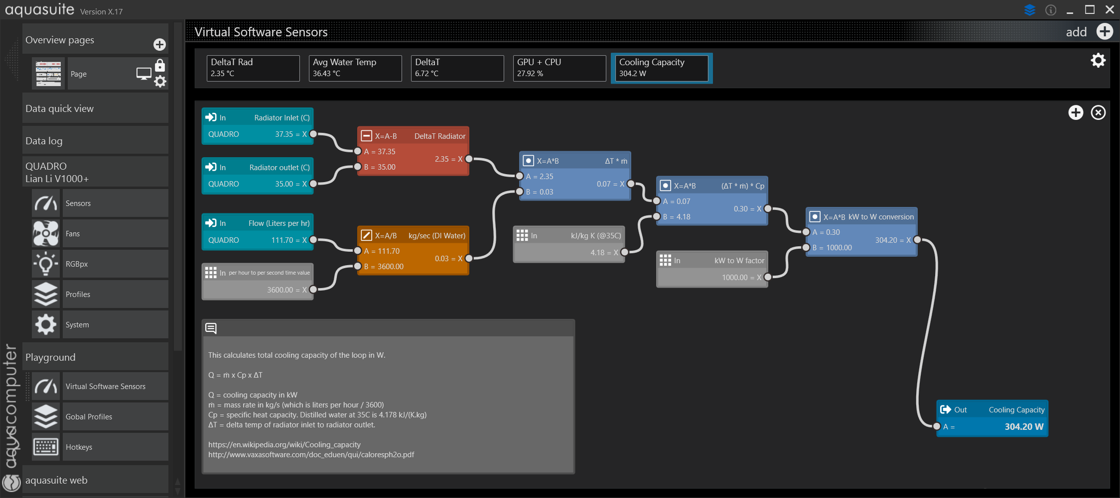 Что я тут подумал... а ведь aquaero и с недавних пор high flow NEXT не единственные устройства обладая которыми можно рассчитывать тепловую мощность системы. Формула известна, а Playground доступен в аквасьюте вне зависимости от того какие устройства есть в наличии. Не вижу что помешало бы использовать Playground подавая на вход расчета дельту воды и показания потока, разумеется если эти данные есть в системе.
