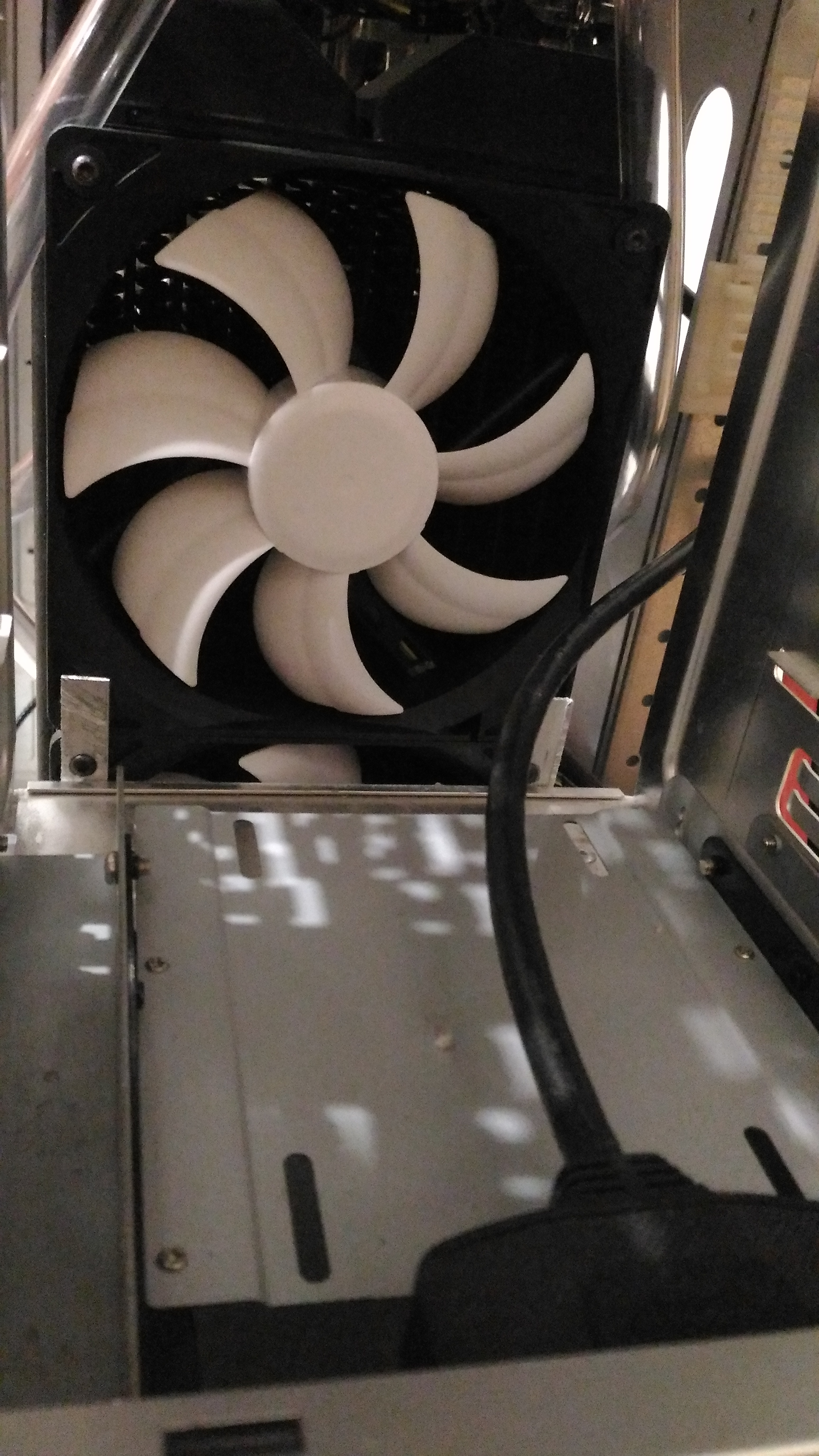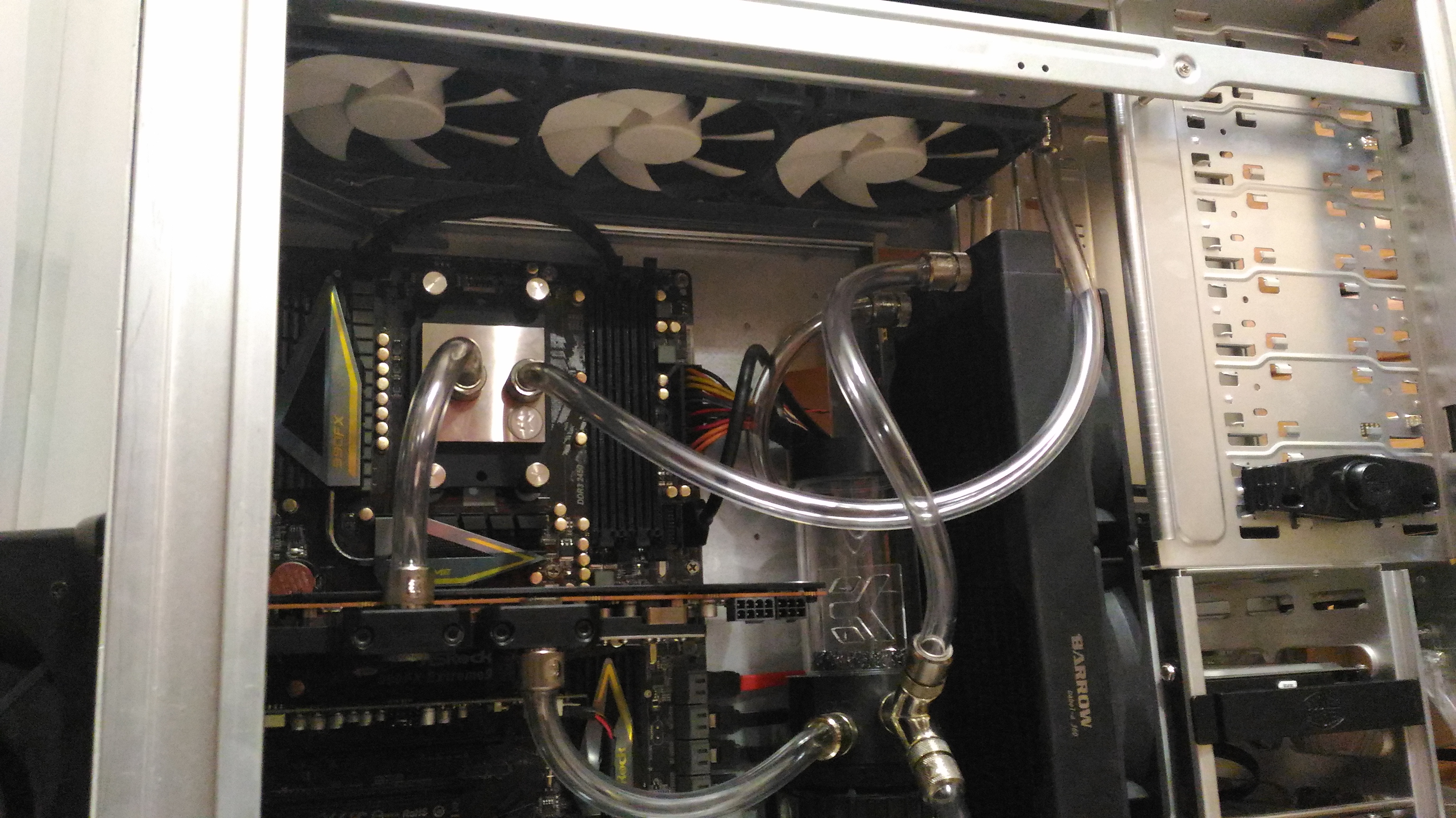 Да можно было бы, наверное, но тогда шланг упирался бы в стенку корпуса и перегибался бы(ну или пришлось бы искать угловые фитинги). Либо можно было пустить вертикально его, это вариант. Короче, лоханулся я чутка, когда брал сплиттер. AmonRA тогда бы был длинный шланг из рада в рад, единственный плюс подобного размещения был бы в том, что не пришлось бы городить из шлангов то, что получилось, чтобы избежать перегибов. Мб в будущем разверну его, пока же положение устраивает. По ватеру ЦПУ - я всё равно несколько часов на протечки погоняю, воздух должен весь выйти, на крайняк положу корпус набок ненадолго. PWSteal возможно, но вот вертикальный рад пришлось силой запихивать, но тут просто надо было раньше сверлить дырки под крепёж помпы на полсантиметра левее, и было бы счастье.