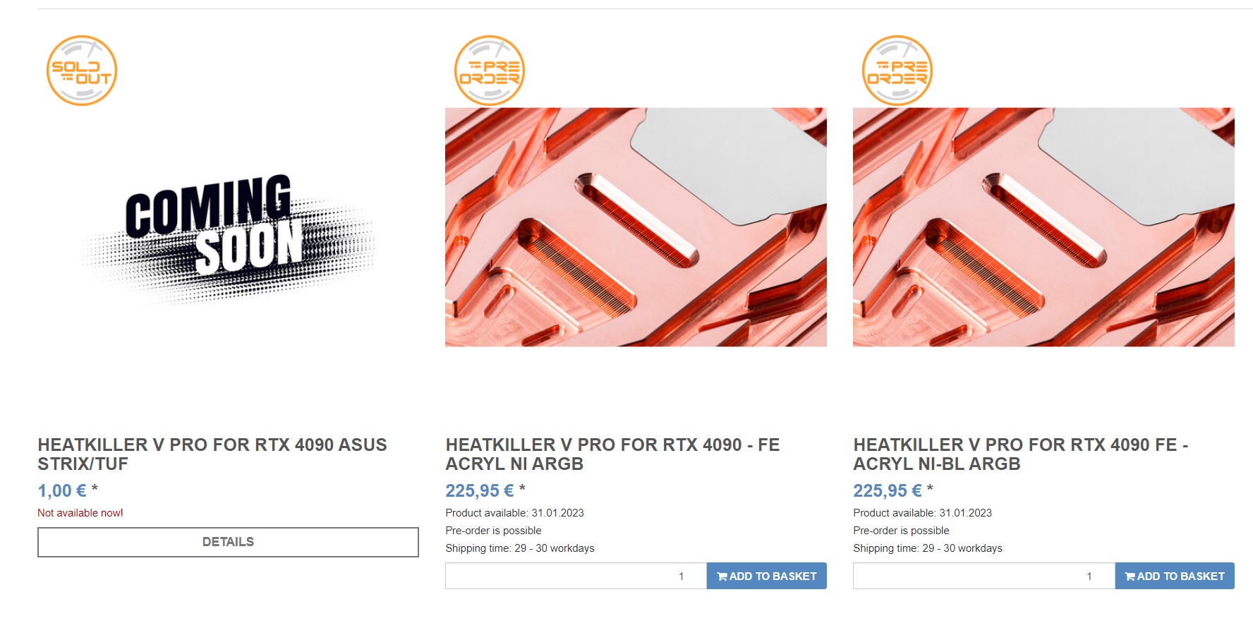 Watercool, пожалуй, вторая компания, применившая модульную/съемную опорную пластину в блоке для поколения RTX4090. Но карты выбрали совсем не "народные", FE и стрикc/TUF. Цена вопроса - 190 евро без НДС и стоимости доставки. Доступность: 31.01.2023