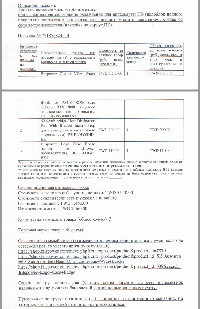 aggression офигеть конечно, вам таможня скучать не дает у меня таможня пару раз просила написать в ватсап что в посылке и для чего, и подтвердить что я везу этот товар для личного пользования но не так педантично если ты набирал эти документы в ворде а потом посылал им по факсу, то ссылки с бумаги наверное эпично набирать им было еще вопрос в догонку, чего ты с пломбой решил, повреждать ? снимать ? насколько я помню асус лепит, в отличии от гиги, правда на гигу нет вб и гиги тоже нет если честно