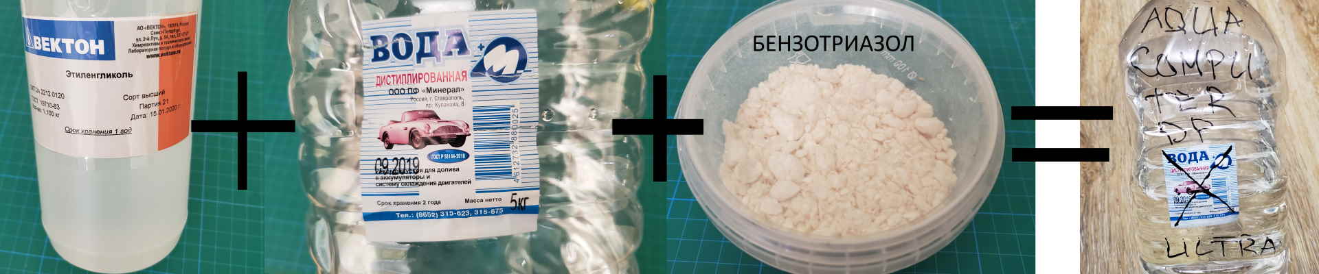 Вообщем попробовал сделать свою жижу. по следующему рецепту (см. вложения). стоимость (как на картинке) :400 + 100(грубо)+ 250 (за 50 гр) = 850 - 900руб. ( с учетом разных цен можно округлить до 1000р) в итоге получил 5л жижы. Как готовил: Из 5-тишки вылил литр дистилята, залил 1л гликоля. Добавил 3 гр бензотриазола. перемешал. подождал пока бензотриазол растворится.( сначала плавает хлопьями надо подождать.) В итоге на 5л жижы получил 20% гликоля и бензотриазол (<1%). чем не Aqua DP Ultra